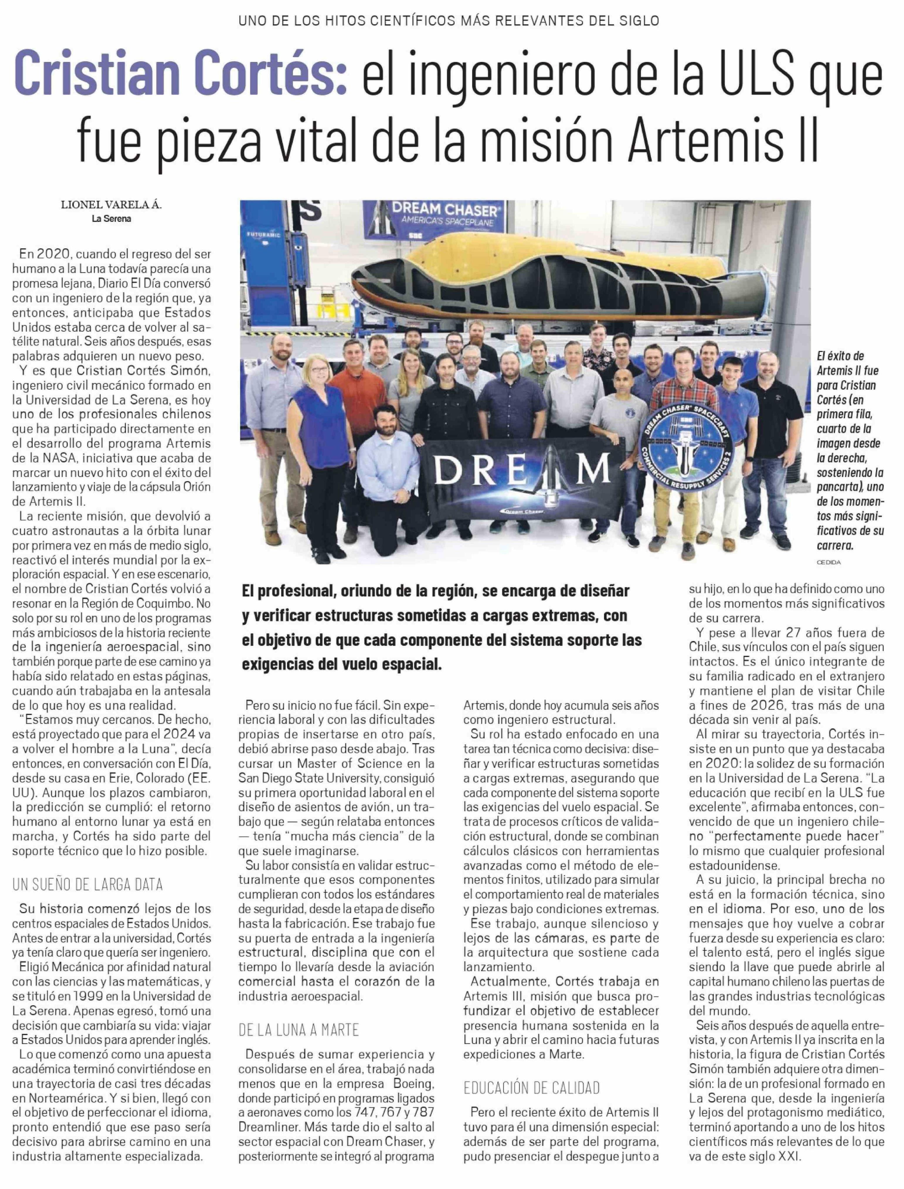 Cristian Cortés: el ingeniero de la ULS que fue pieza vital de la misión Artemis II 25-04-2026 El Ovallino |