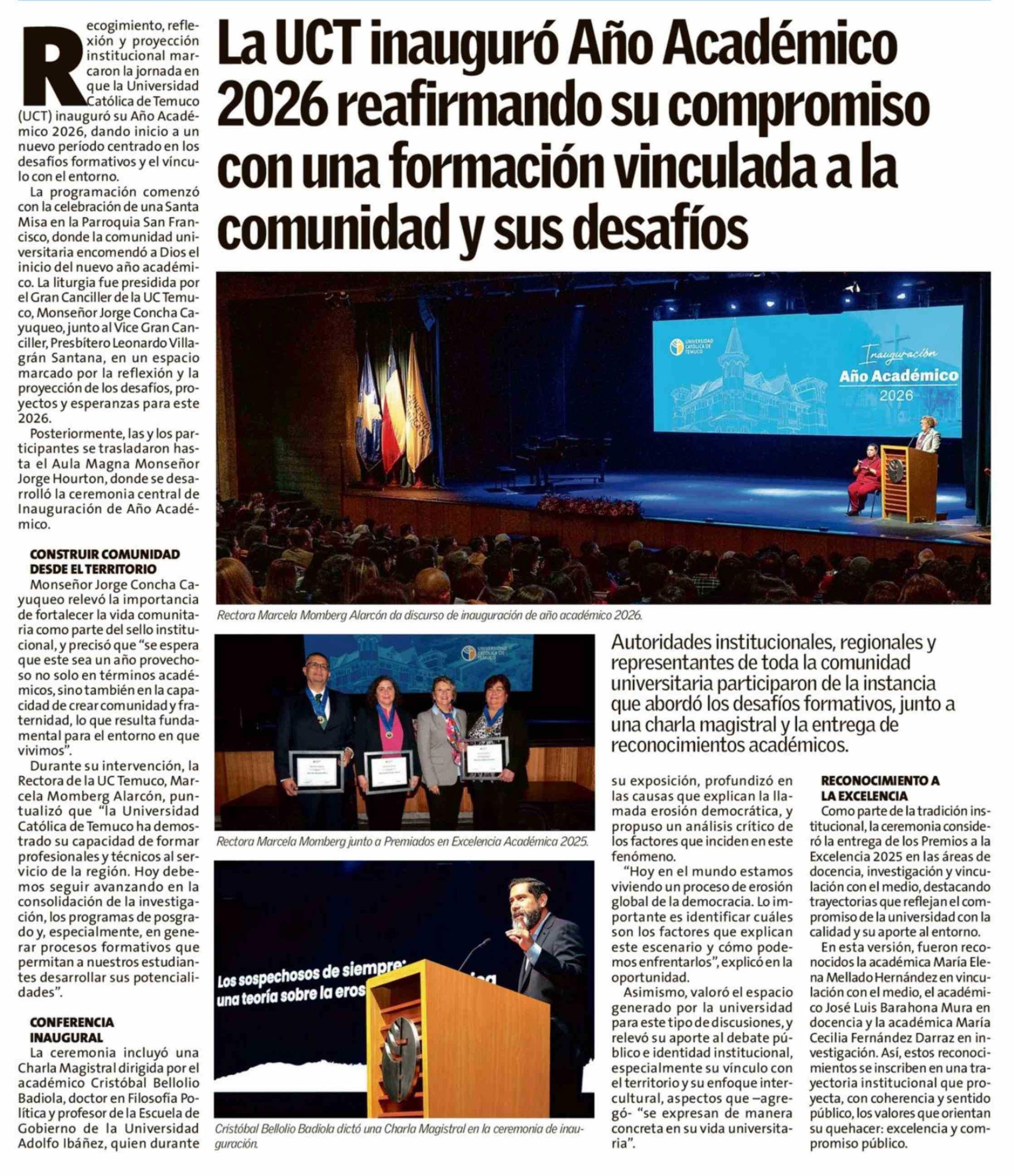 La UCT inauguró Año Académico 2026 reafirmando su compromiso con una formación vinculada a la comunidad y sus desafíos 12-04-2026 El Austral de la Araucanía |