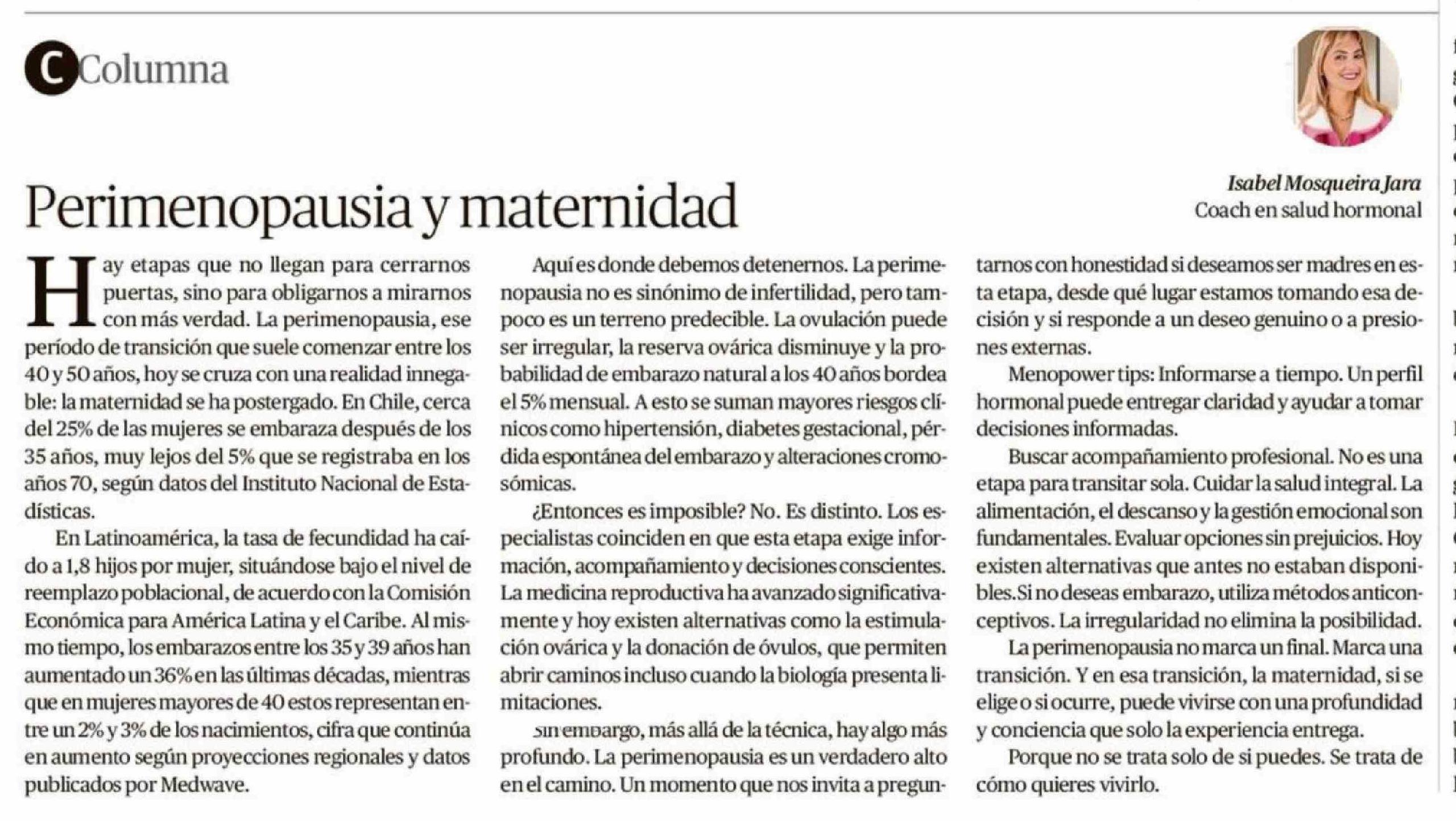 Columnas de Opinión: Perimenopausia y maternidad 24-04-2026 Diario Austral Región de Los Ríos |