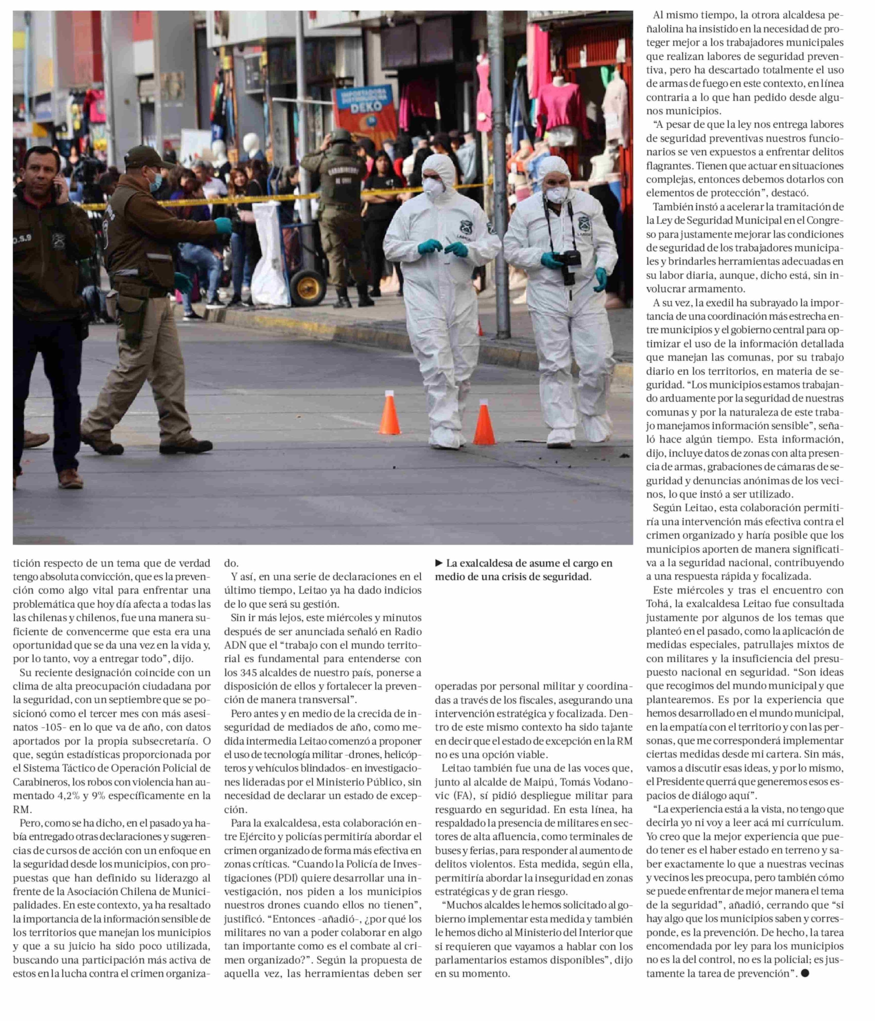 Optimizar trabajo con municipios o uso “intermedio de militares: las ideas que la nueva subsecretaria Leitao impulsó como alcaldesa 07-11-2024 La Tercera |