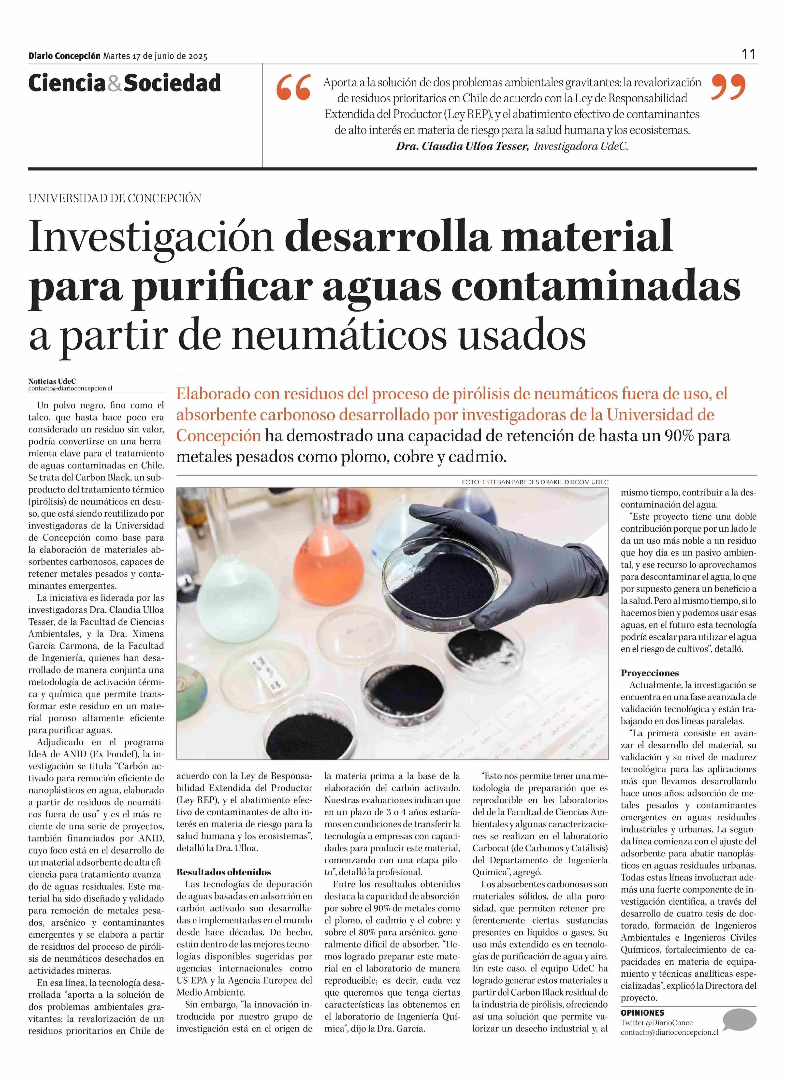 Investigación desarrolla material para purificar aguas contaminadas a partir de neumáticos usados 17-06-2025 Diario Concepción |