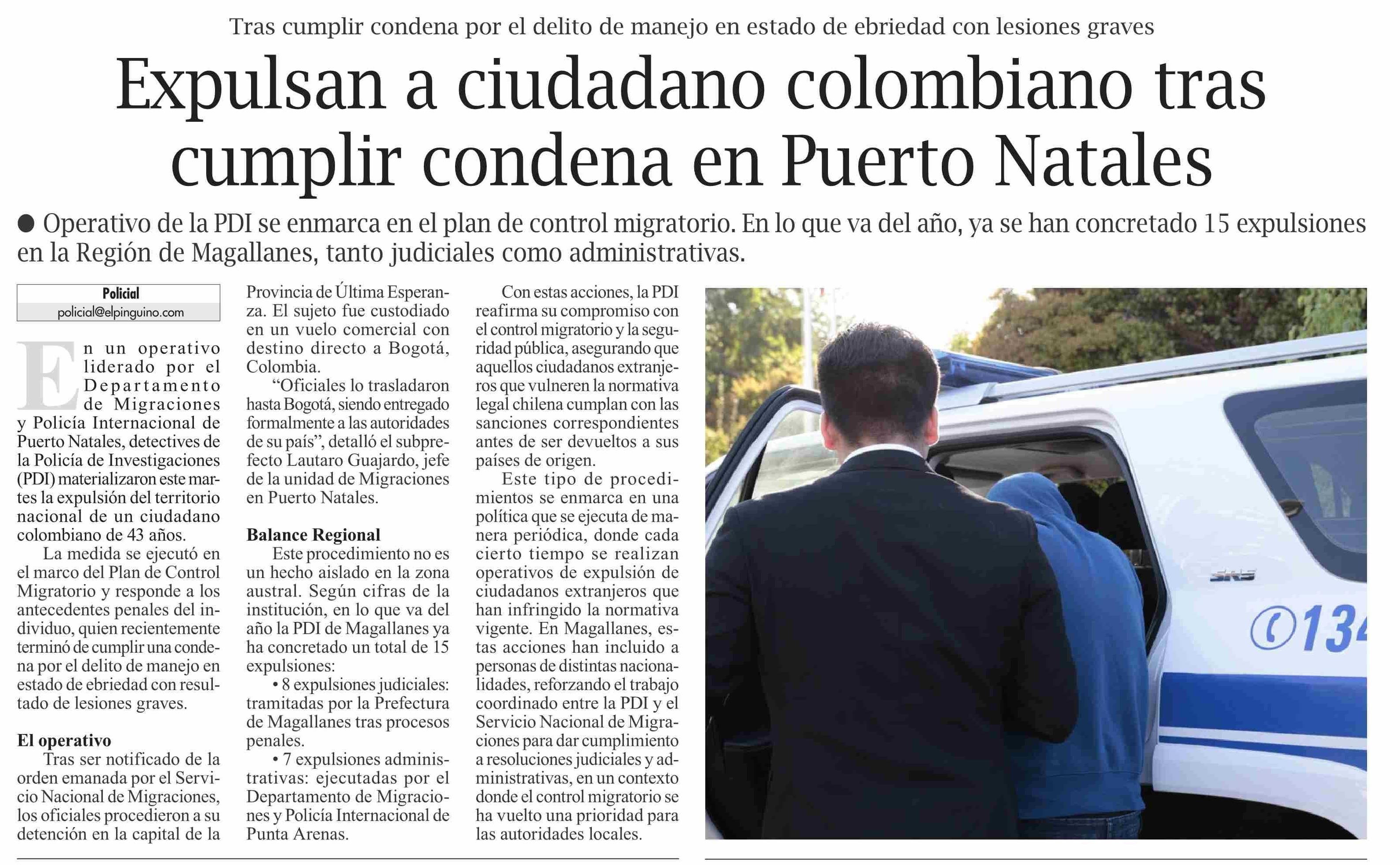 | Título: | Expulsan a ciudadano colombiano tras cumplir condena en Puerto Natales |