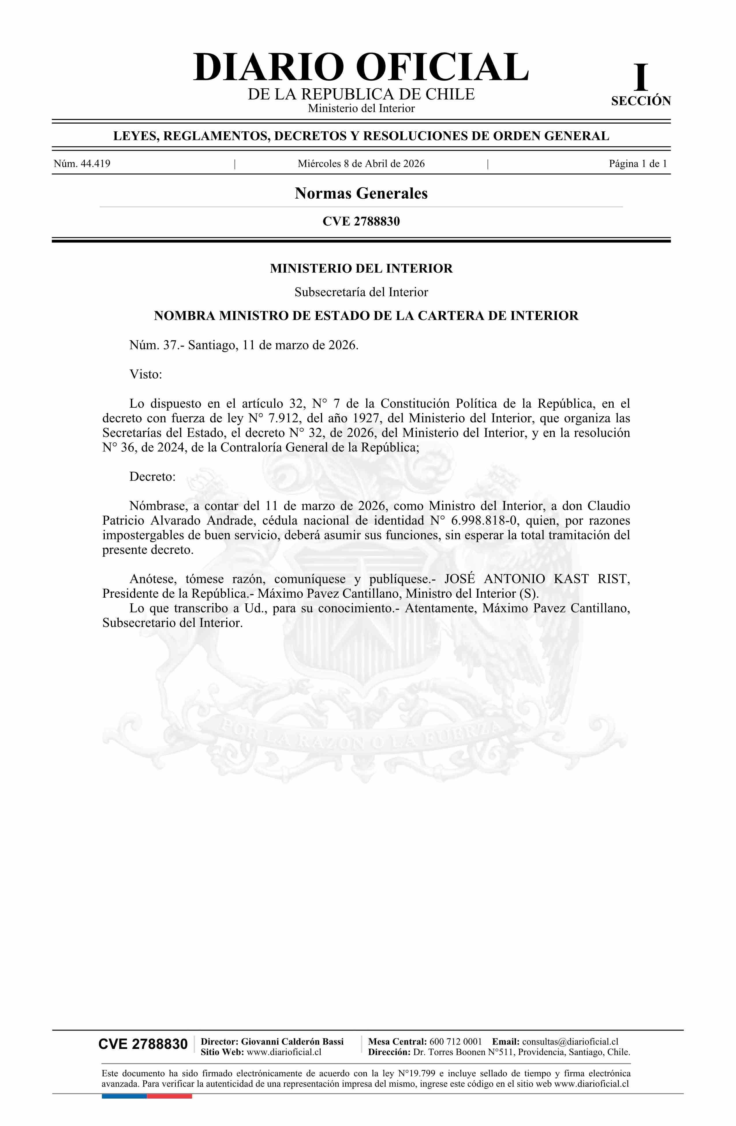 Decreto número 37, de 2026.- Nombra a don Claudio Patricio Alvarado Andrade como Ministro de Estado de la Cartera de Interior 08-04-2026 Diario Oficial Edición Electrónica |