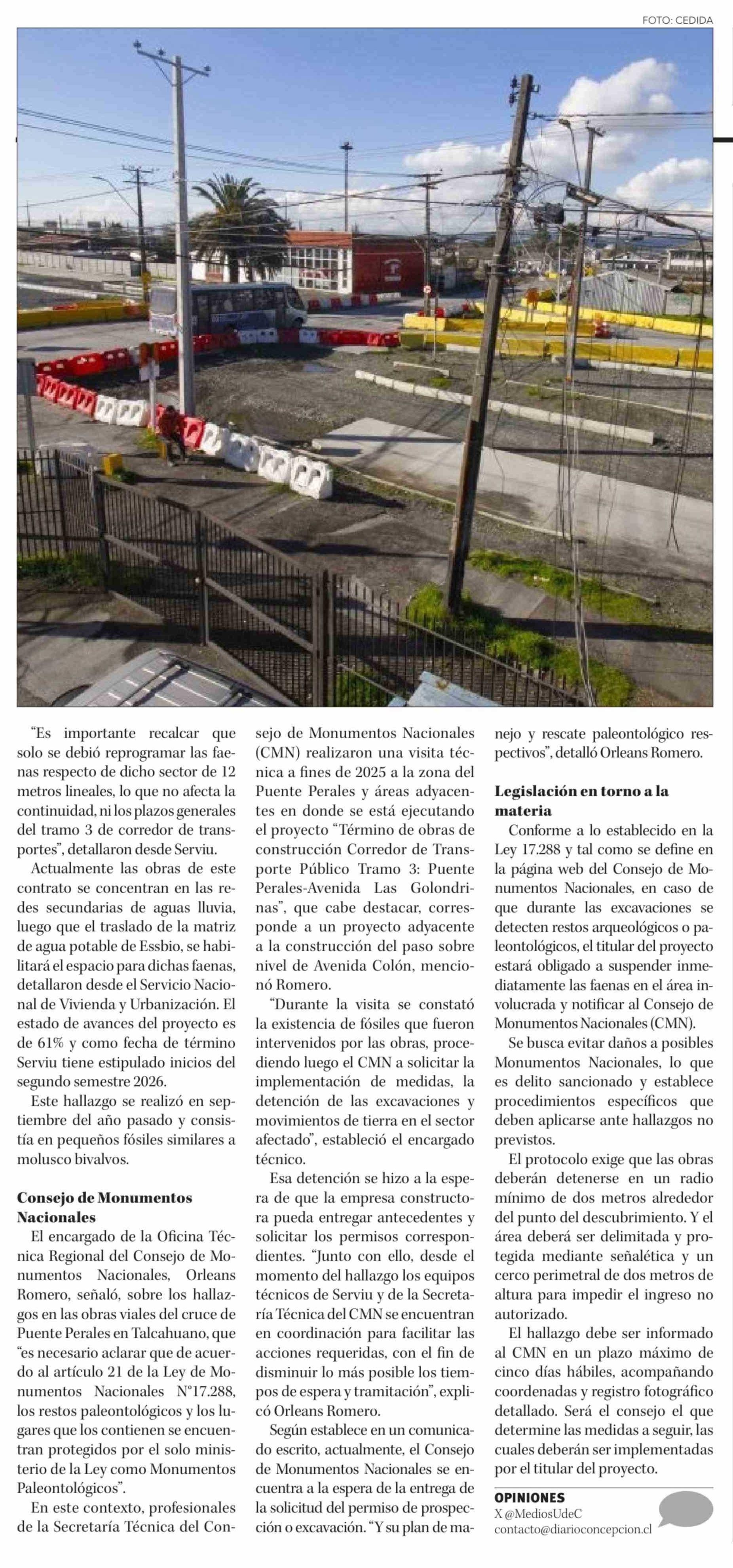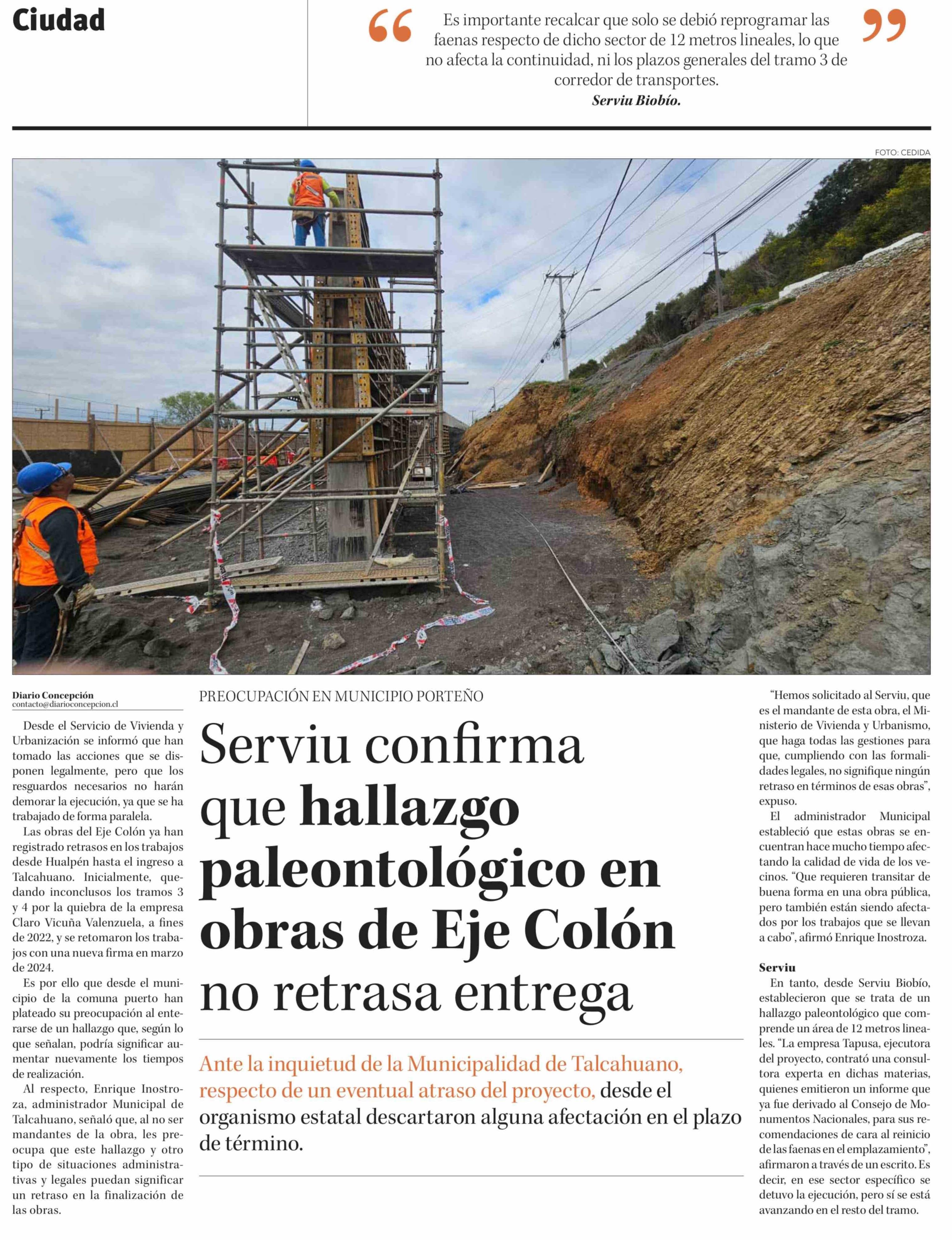 Título: Serviu confirma que hallazgo paleontológico en obras de Eje Colón no retrasa entrega