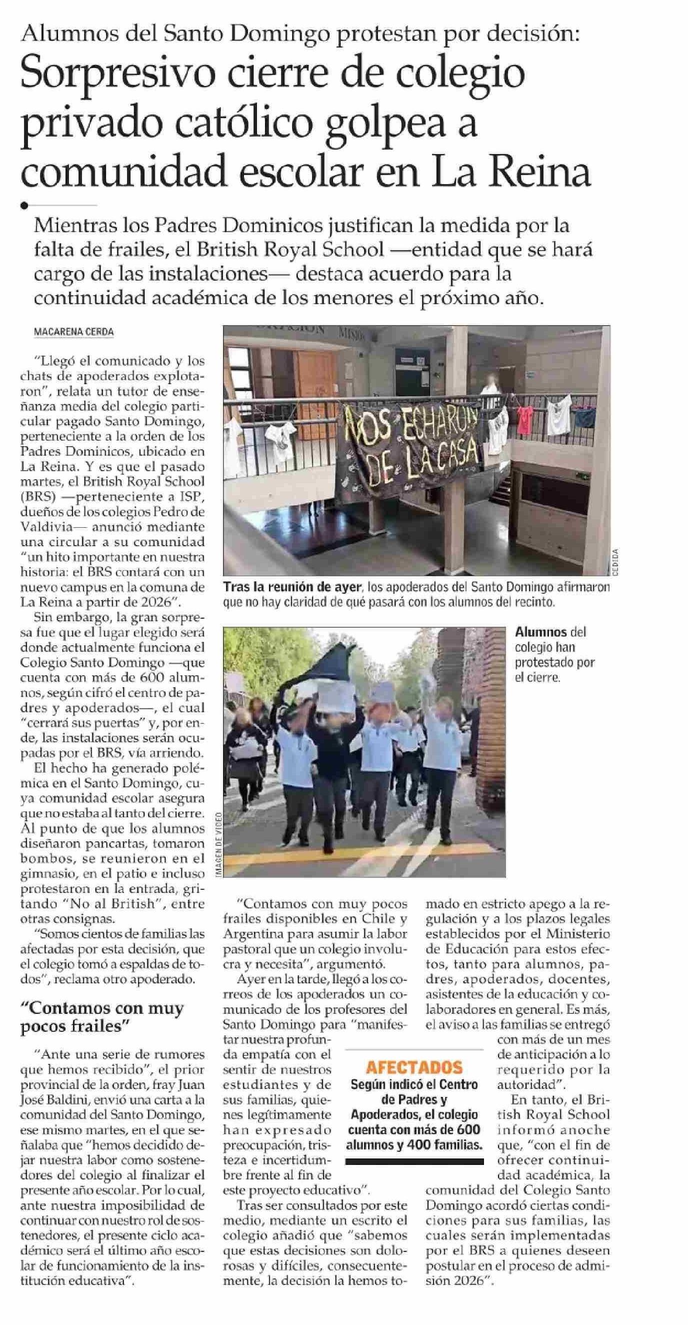 Sorpresivo cierre de colegio privado católico golpea a comunidad escolar en La Reina 16-05-2025 El Mercurio |
