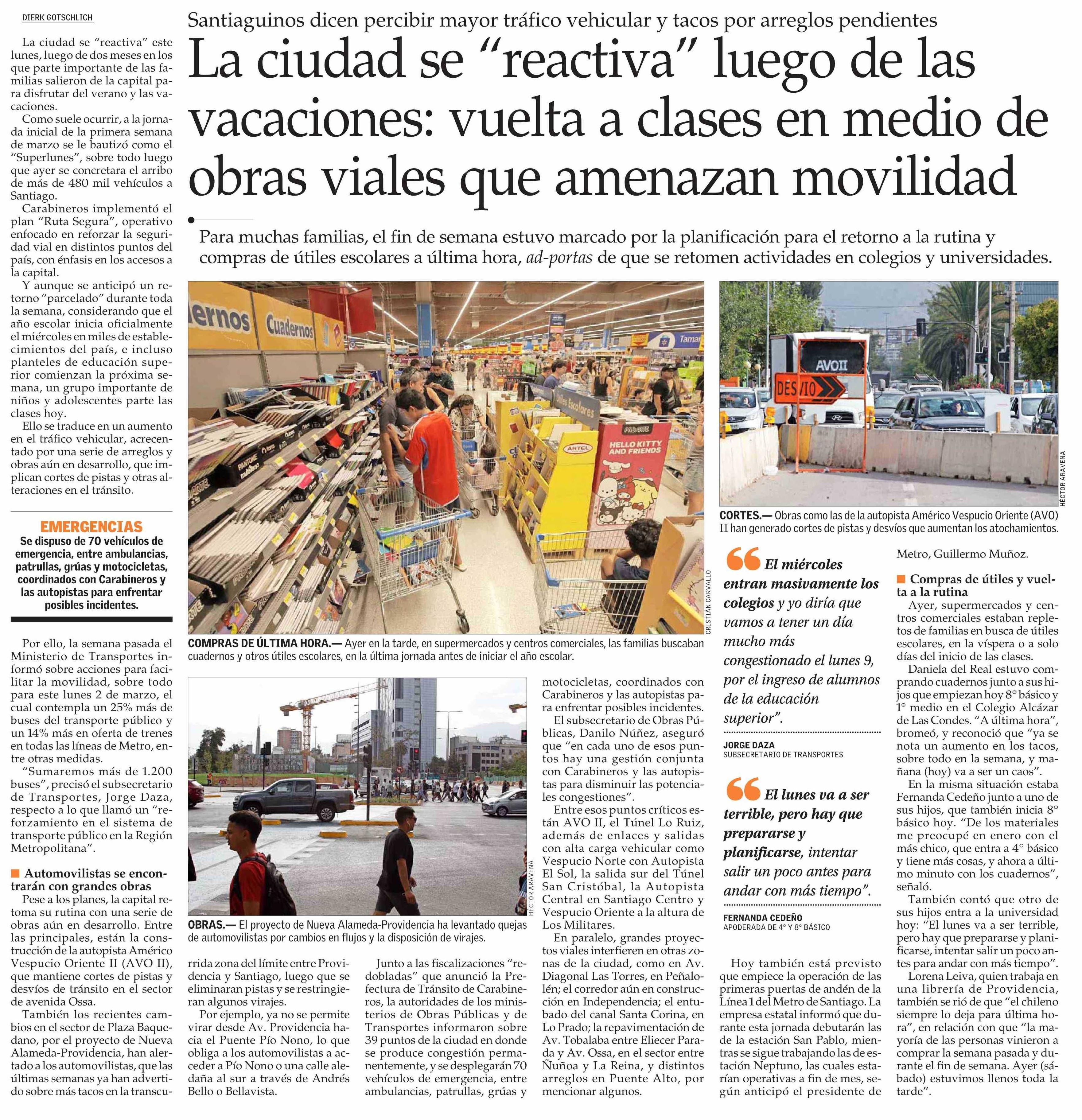 La ciudad se “reactiva” luego de las vacaciones: vuelta a clases en medio de obras viales que amenazan movilidad 02-03-2026 El Mercurio |