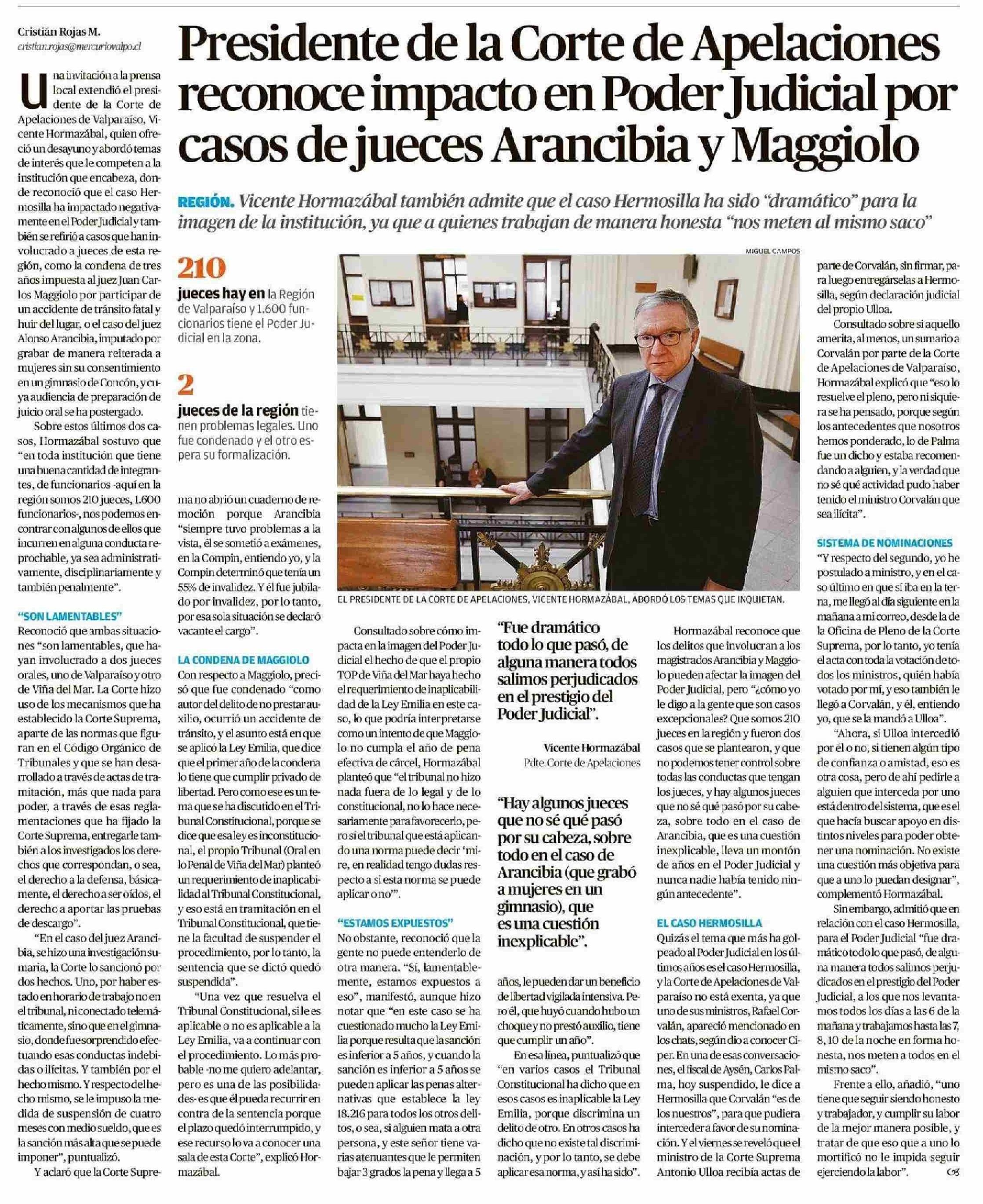 Presidente de la Corte de Apelaciones casos de jueces Arancibia y Maggiolo reconoce impacto en Poder Judicial por 20-06-2025 El Mercurio de Valparaíso |