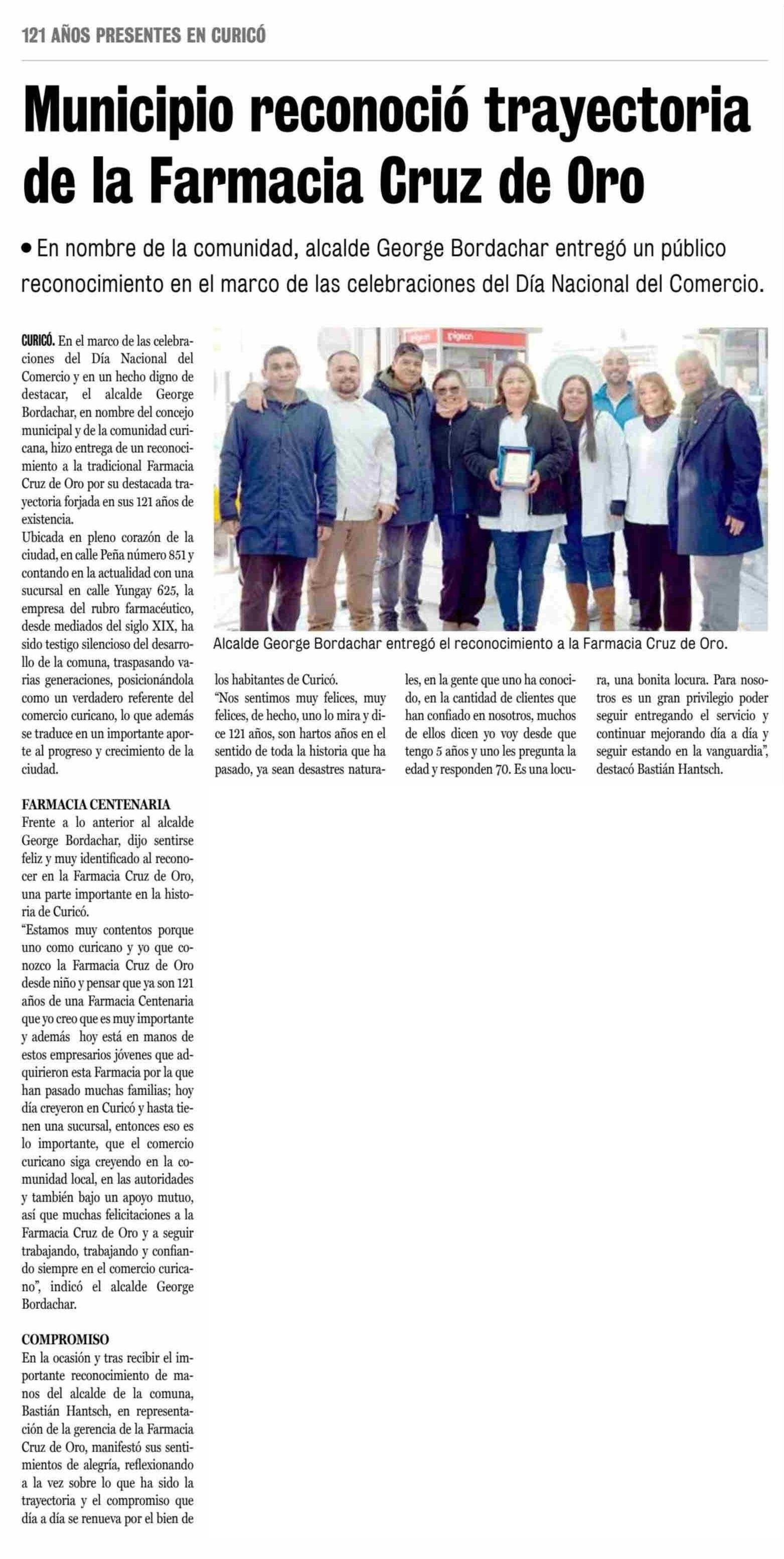 Municipio reconoció trayectoria de la Farmacia Cruz de Oro 08-06-2025 La Prensa de Curicó |