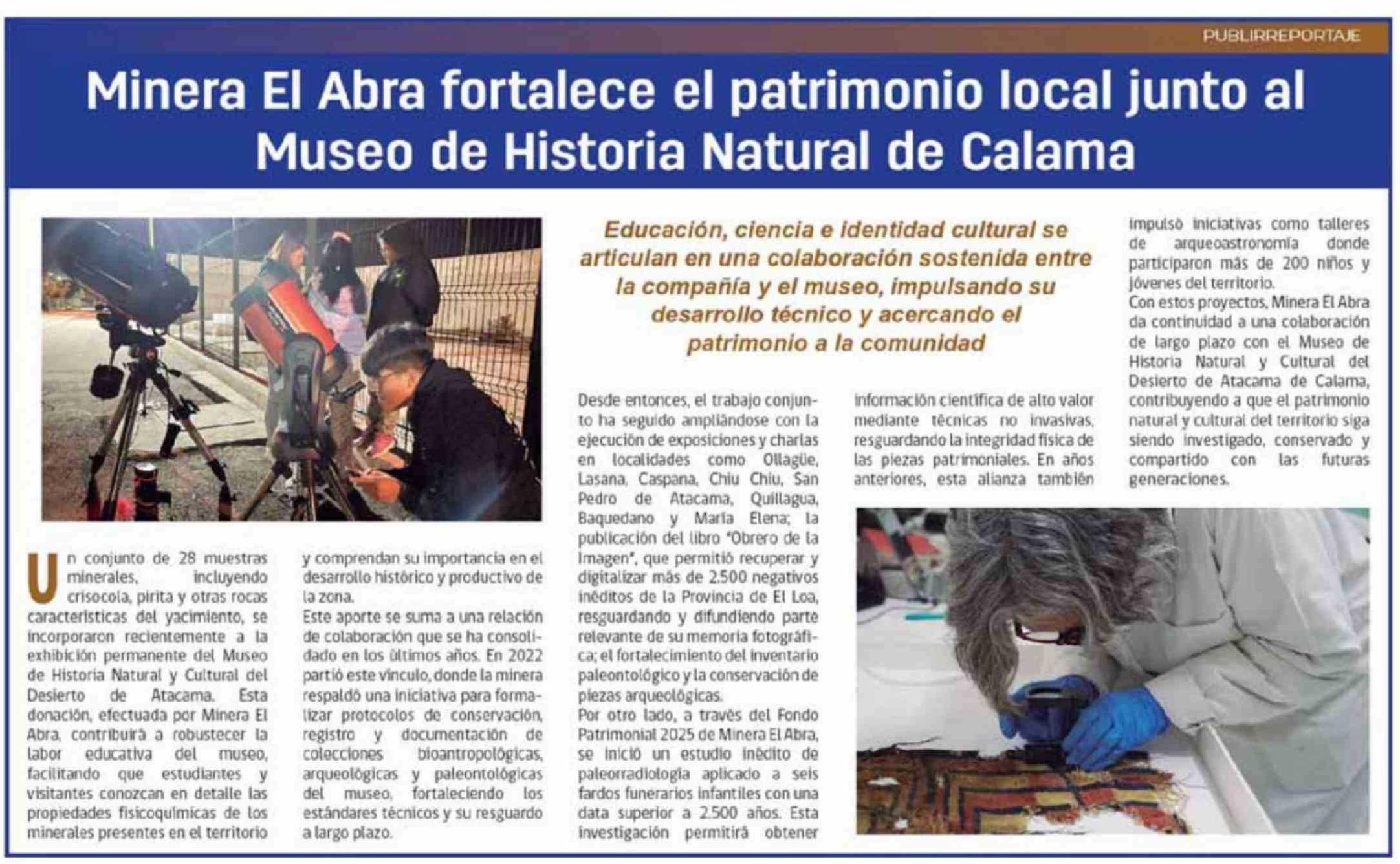 Minera El Abra fortalece el patrimonio local junto al Museo de Historia Natural de Calama 02-03-2026 El Mercurio de Calama |