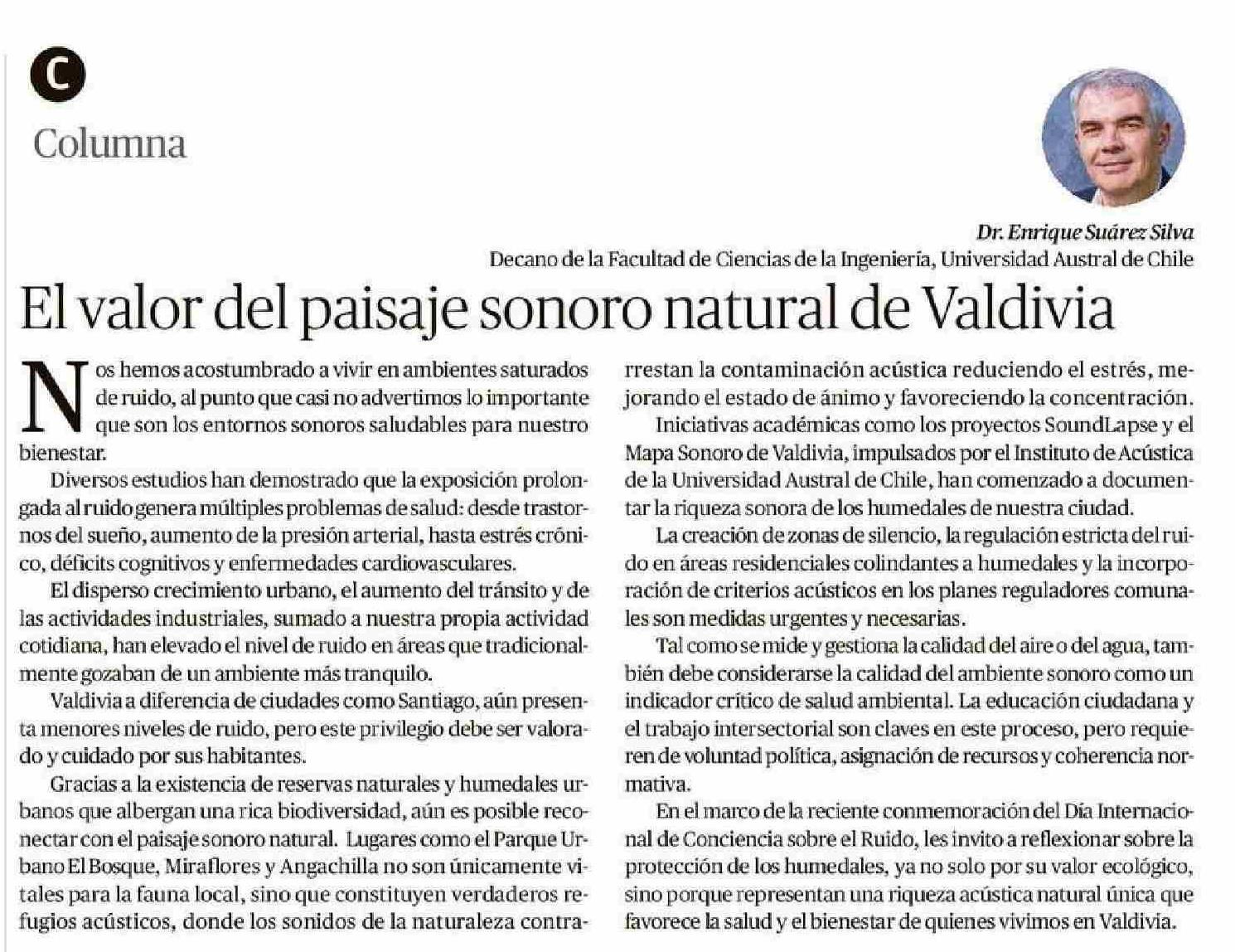 COLUMNAS DE OPINIÓN: El valor del paisaje sonoro natural de Valdivia 08-05-2025 Diario Austral Región de Los Ríos |