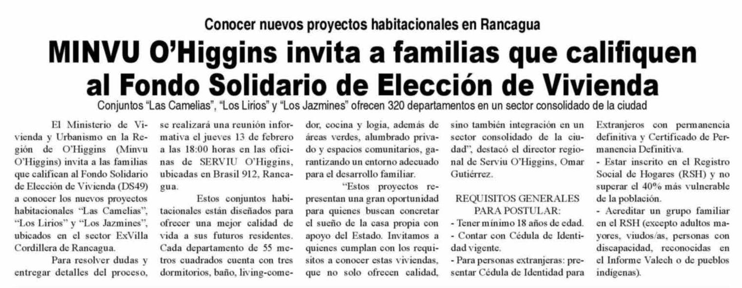 MINVU O'Higgins invita a familias que califiquen al Fondo Solidario de Elección de Vivienda 12-02-2025 Diario VI Región |