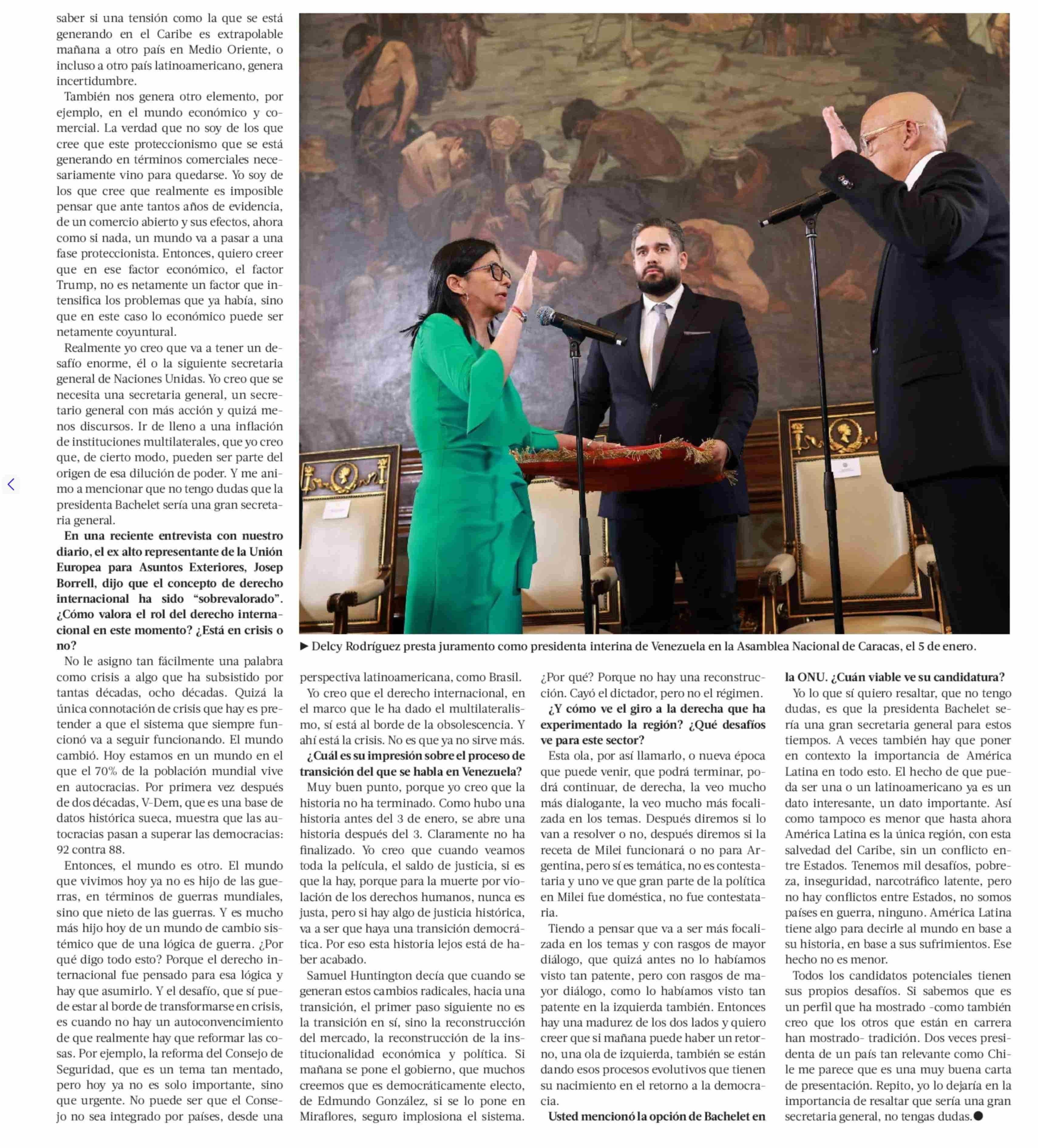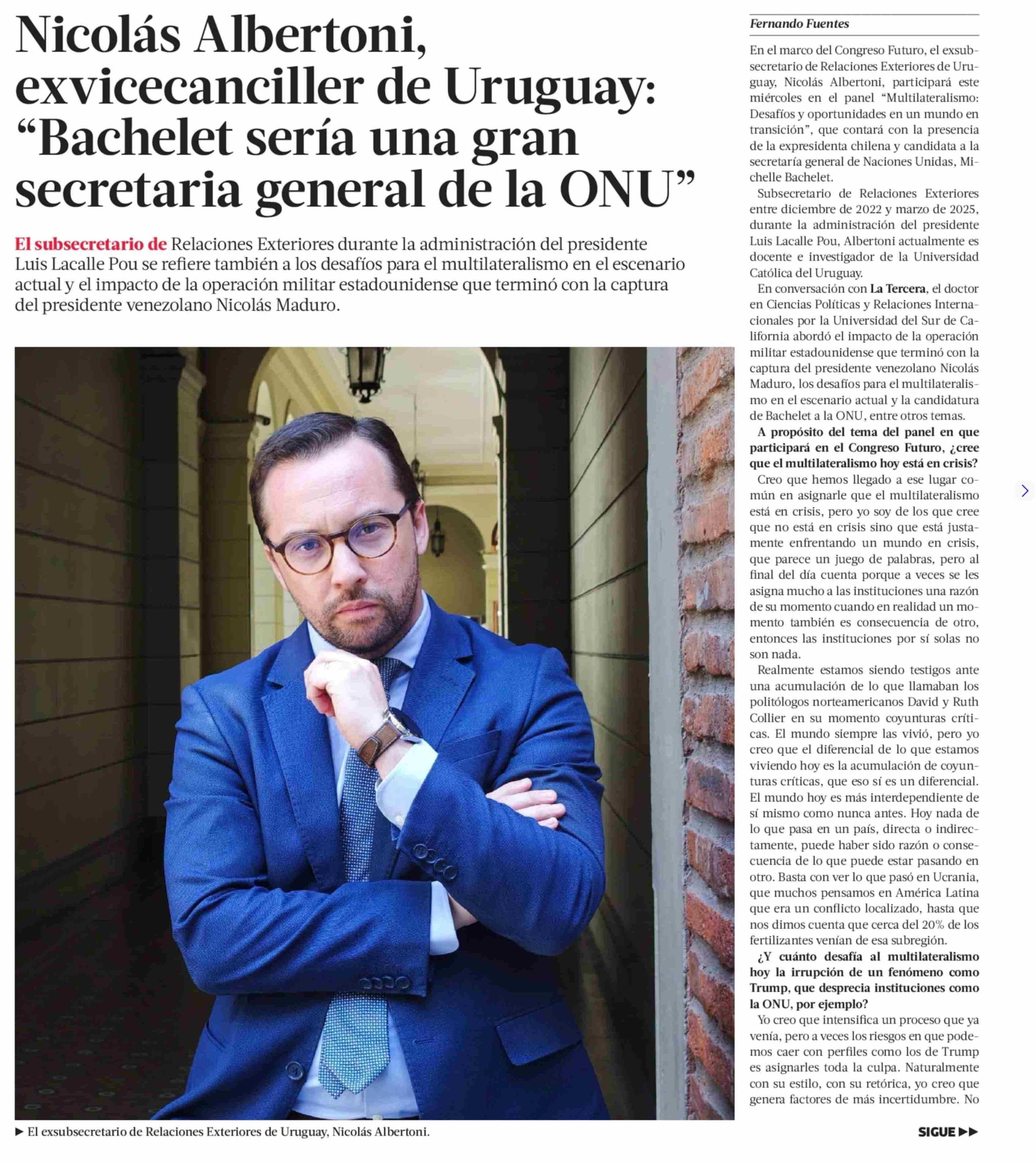 Nicolás Albertoni, exvicecanciller de Uruguay: "Bachelet sería una gran secretaria general de la ONU" 15-01-2026 La Tercera |