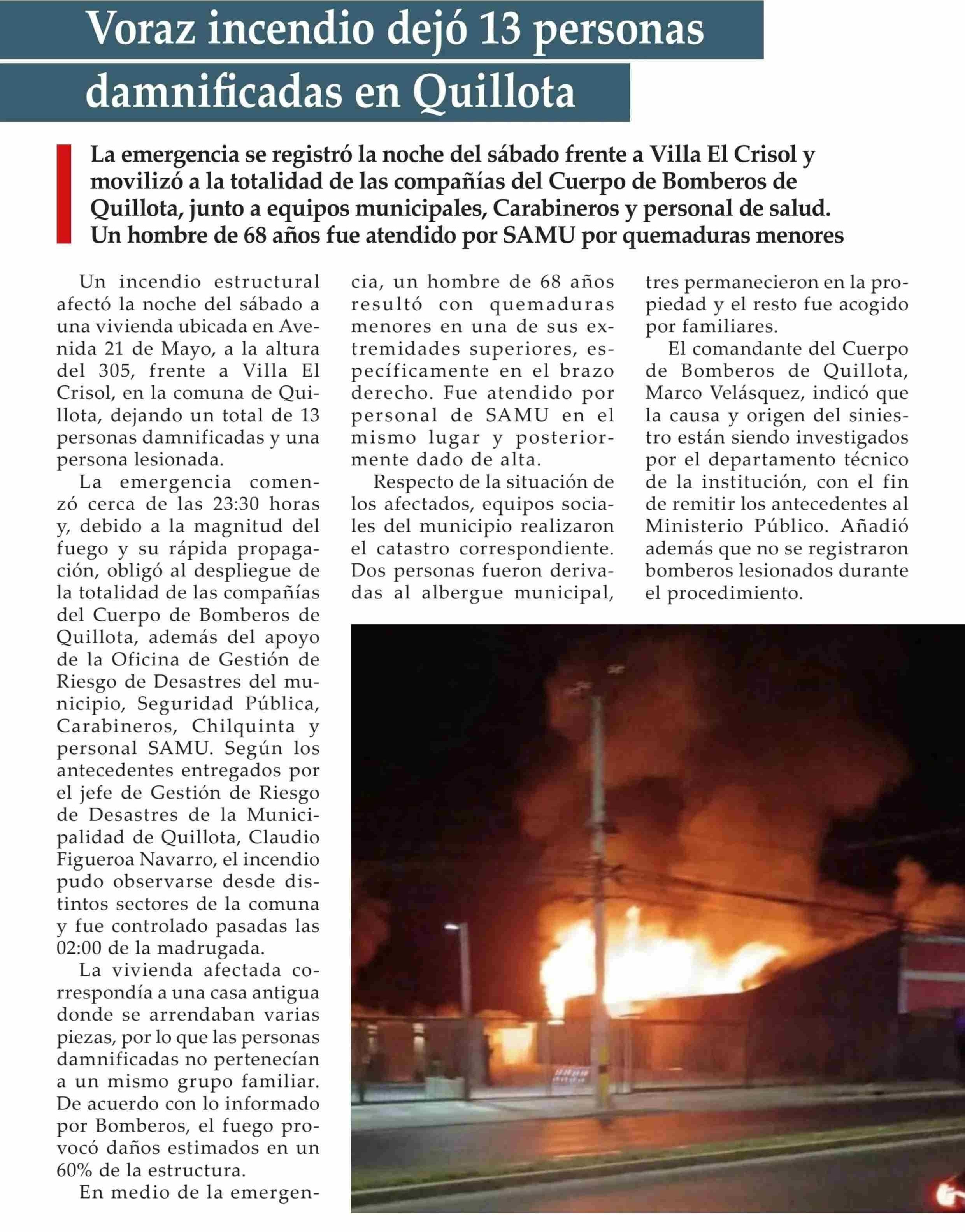 Título: Voraz incendio dejó 13 personas damnificadas en Quillota
