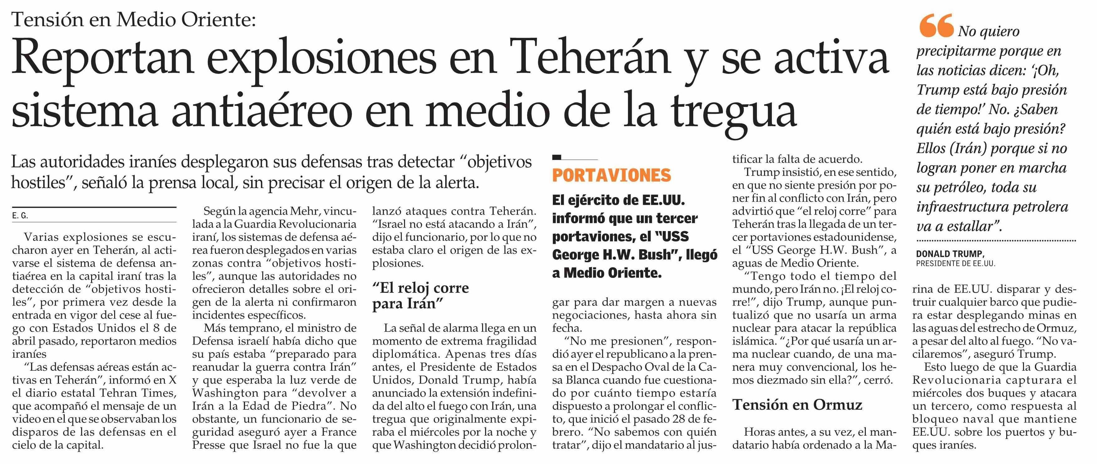 | Título: | Reportan explosiones en Teherán y se activa sistema antiaéreo en medio de la tregua |