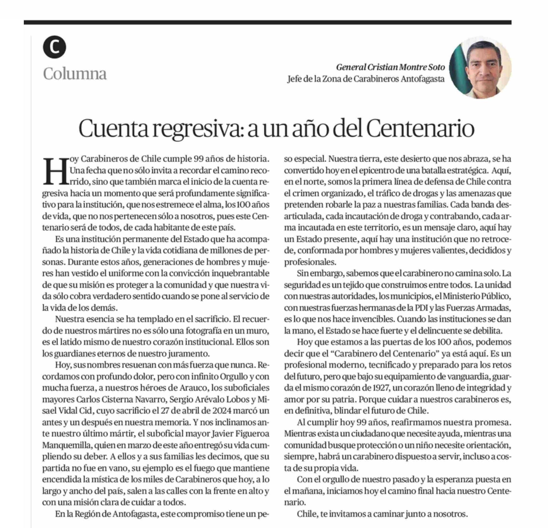 COLUMNAS DE OPINIÓN: Cuenta regresiva, a un año del Centenario 27-04-2026 El Mercurio de Antofagasta |
