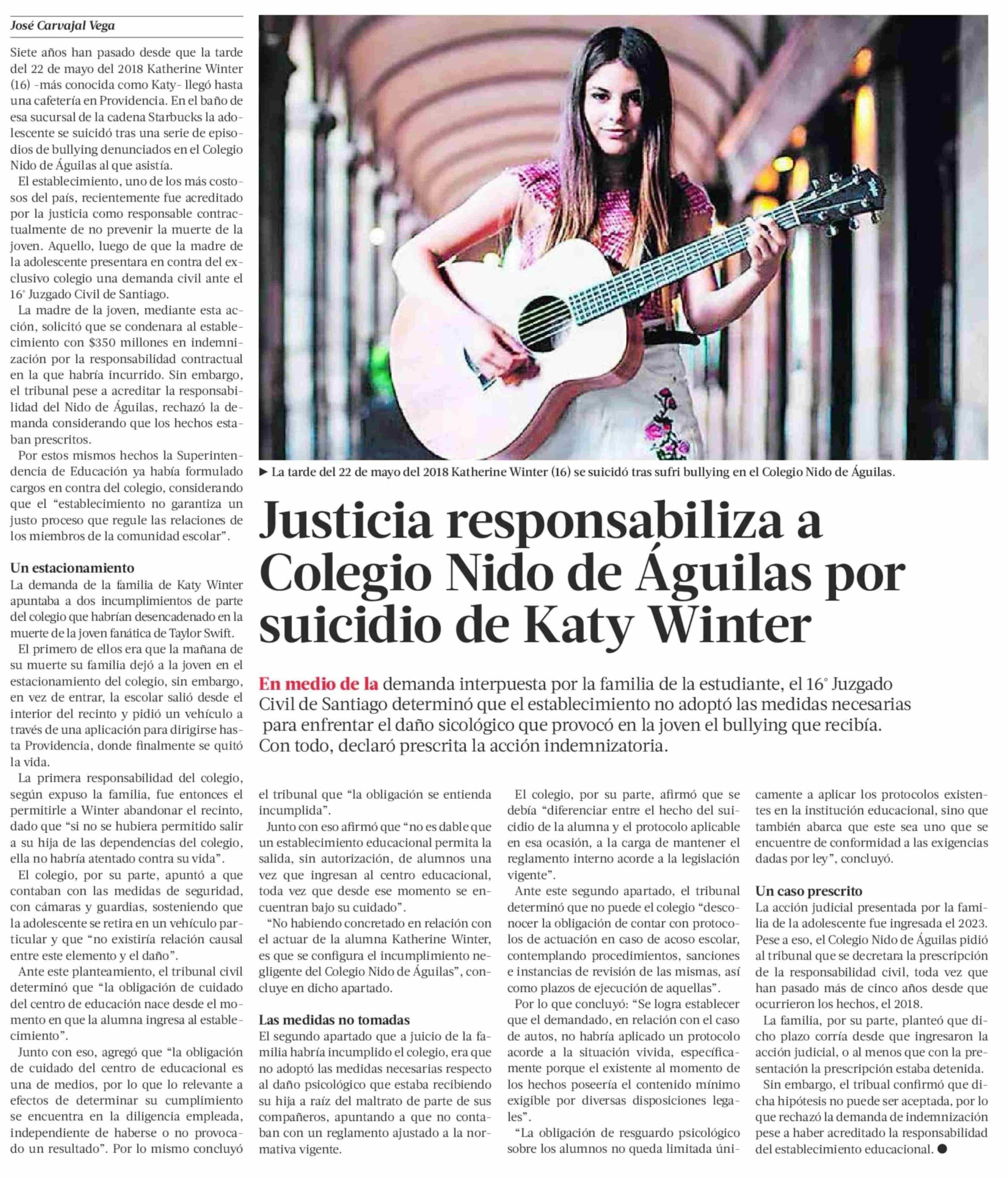 Justicia responsabiliza a Colegio Nido de Aguilas por suicidio de Katy Winter 17-06-2025 La Tercera |
