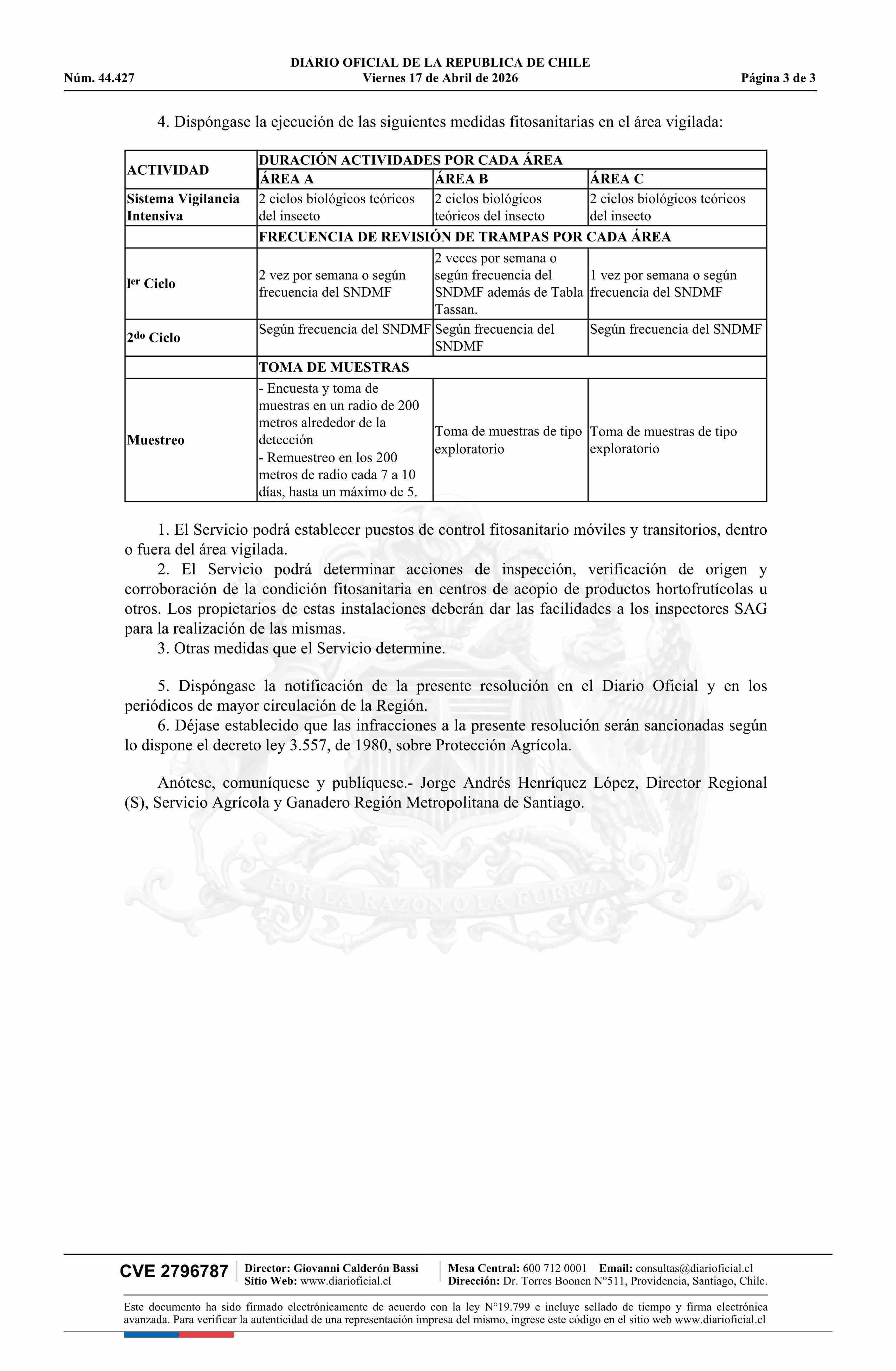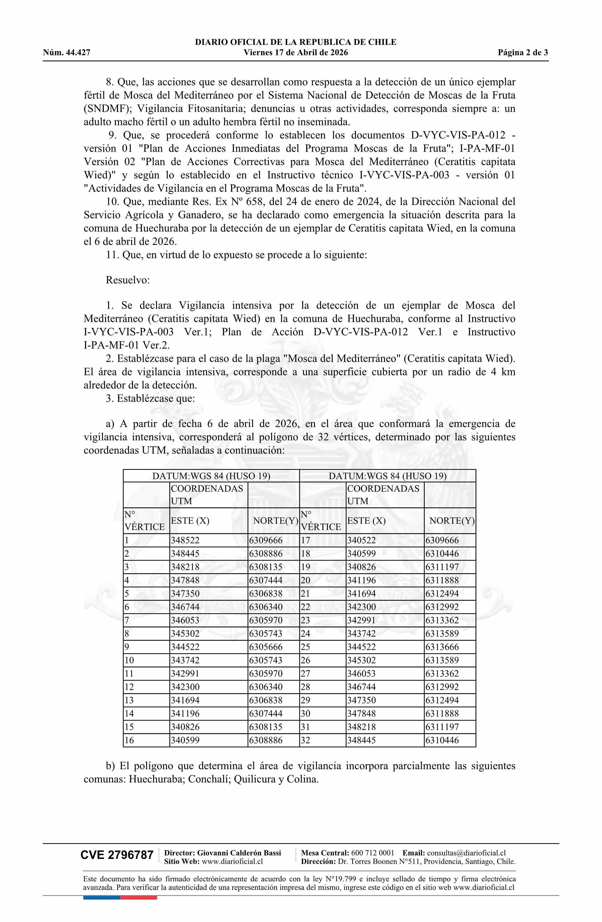 | Título: | Resolución exenta número 690, de 2026.- Activa vigilancia intensiva ante la detección de un único ejemplar adulto de Mosca del Mediterráneo (Ceratitis capitata Wied), comuna de Huechuraba |