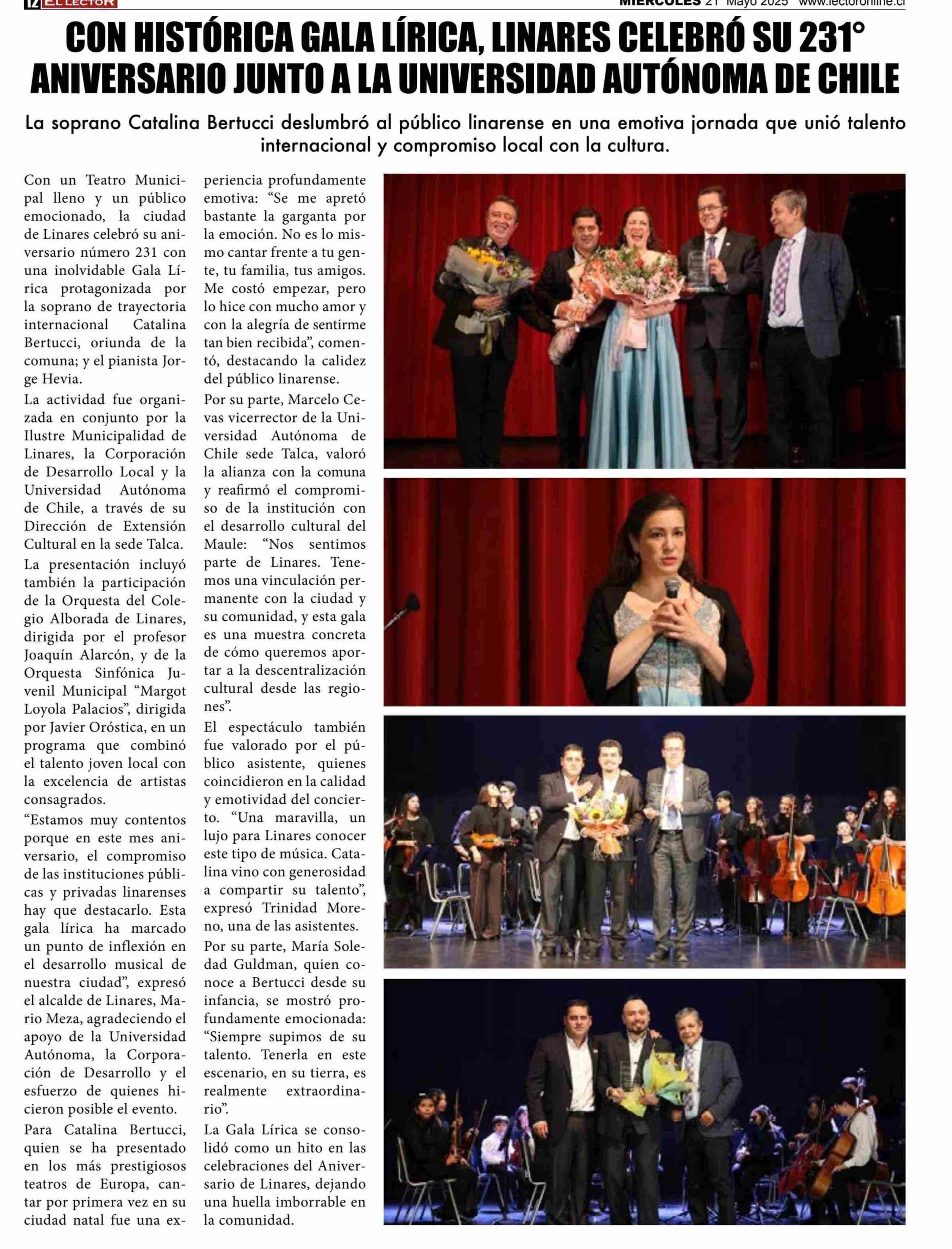 CON HISTÓRICA GALA LÍRICA, LINARES CELEBRÓ SU 231? ANIVERSARIO JUNTO A LA UNIVERSIDAD AUTÓNOMA DE CHILE 21-05-2025 El Lector |