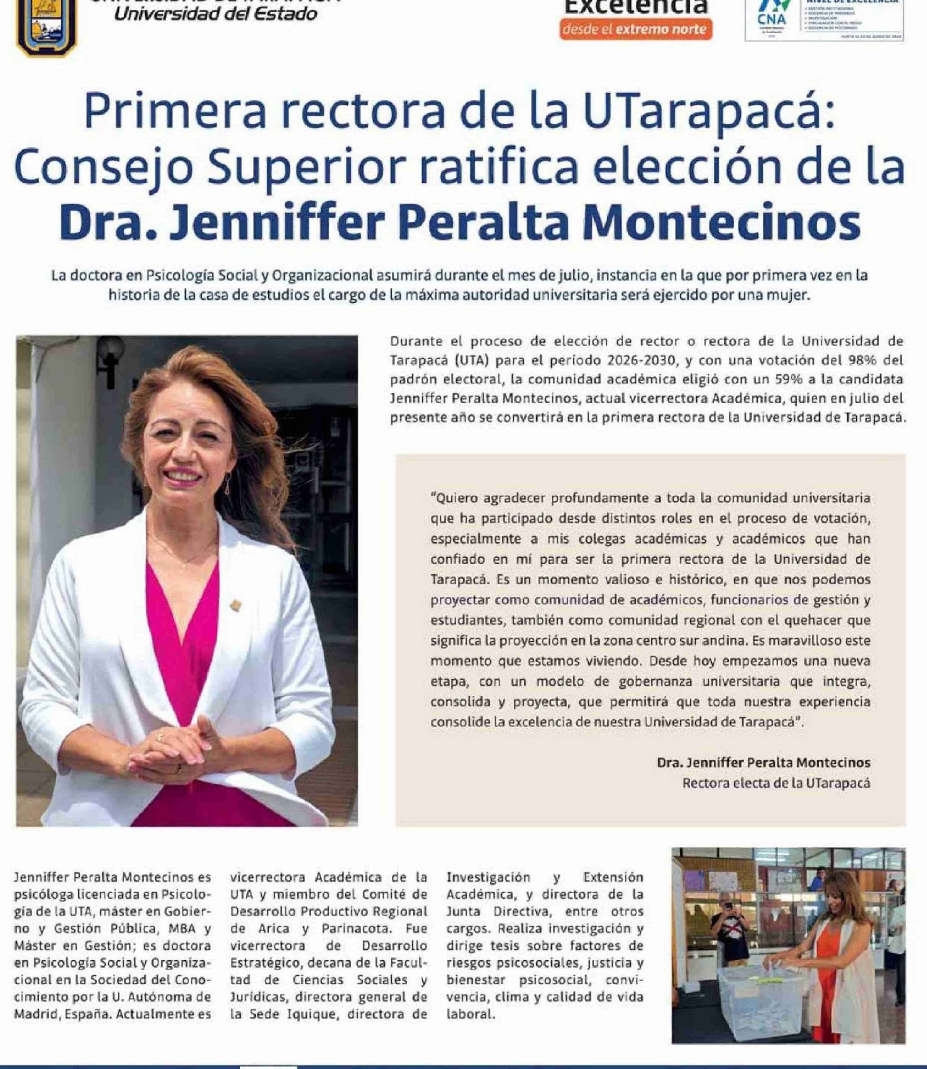 Título: Primera rectora de la UTarapacá: Consejo Superior ratifica elección de la Dra. Jenniffer Peralta Montecinos
