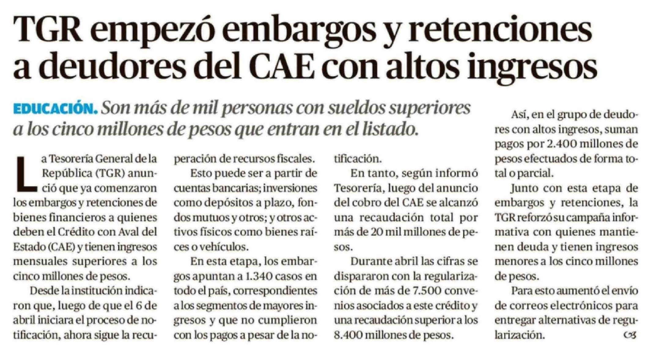 | Título: | TGR empezó embargos y retenciones a deudores del CAE con altos ingresos |