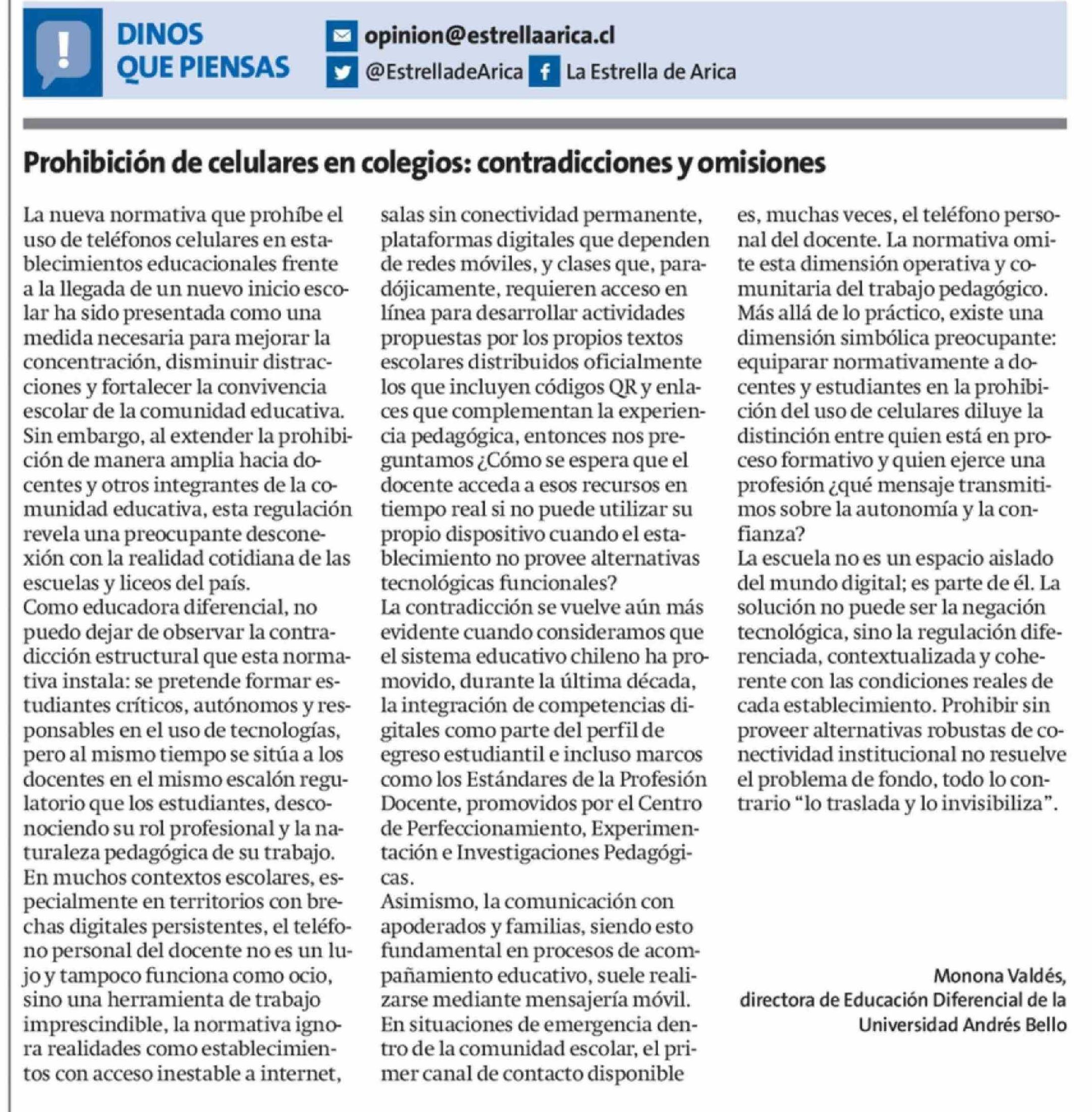 Título: Columnas de Opinión: Prohibición de celulares en colegios: contradicciones y omisiones