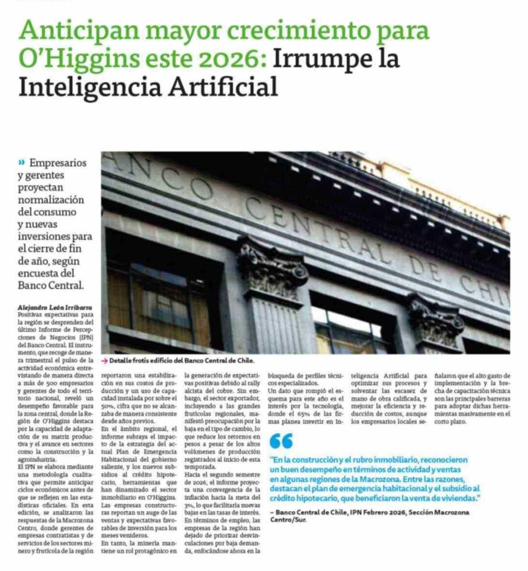 | Título: | Anticipan mayor crecimiento para O'Higgins este 2026: Irrumpe la Inteligencia Artificial |