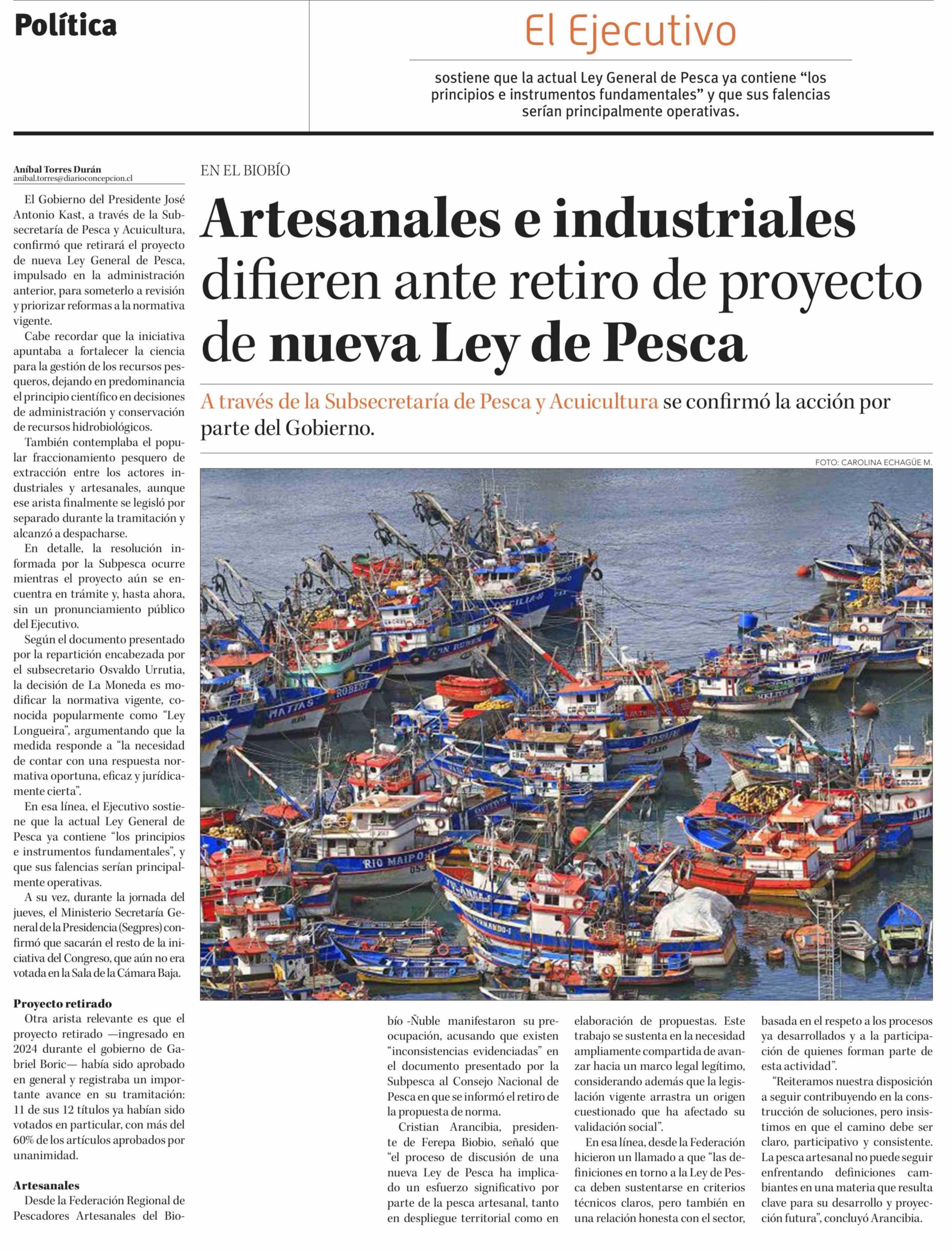 Artesanales e industriales difieren ante retiro de proyecto de nueva Ley de Pesca 27-03-2026 Diario Concepción |