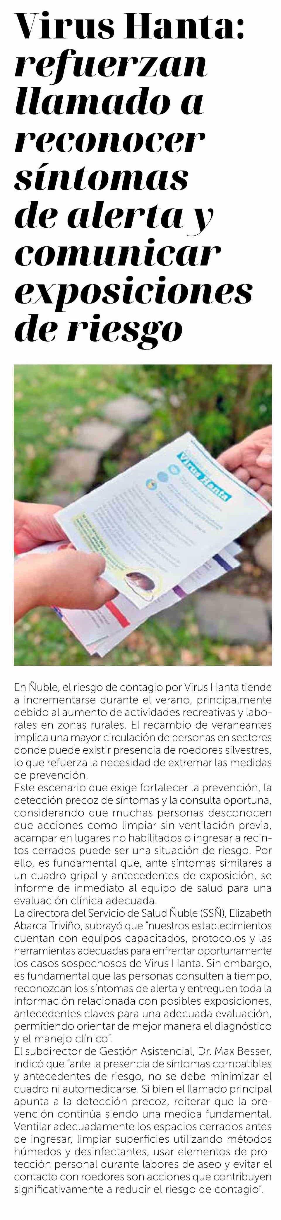 Título: Virus Hanta: refuerzan llamado a reconocer síntomas de alerta y comunicar exposiciones de riesgo
