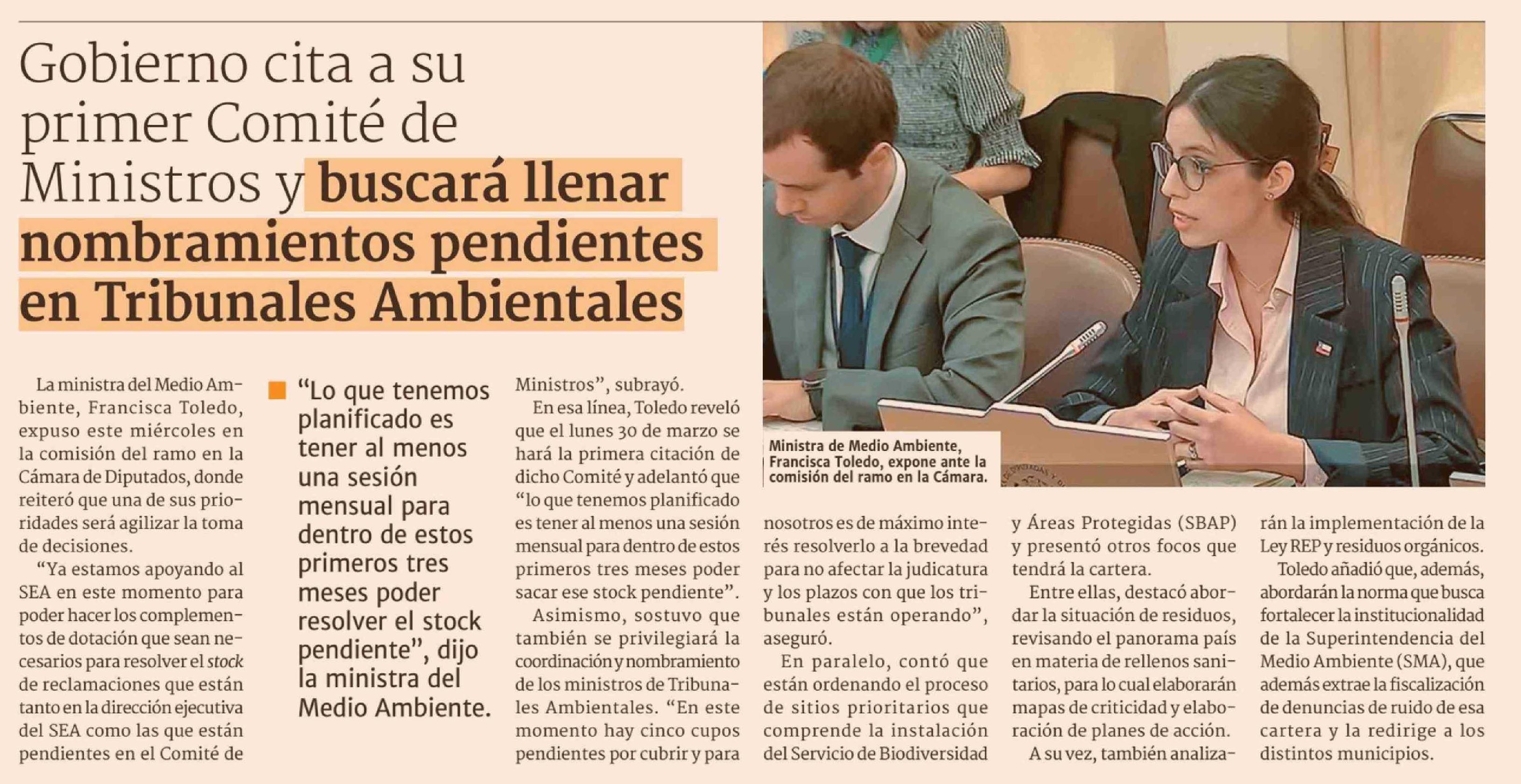 Gobierno cita a su primer Comité de Ministros y buscará llenar nombramientos pendientes en Tribunales Ambientales 26-03-2026 Diario Financiero |