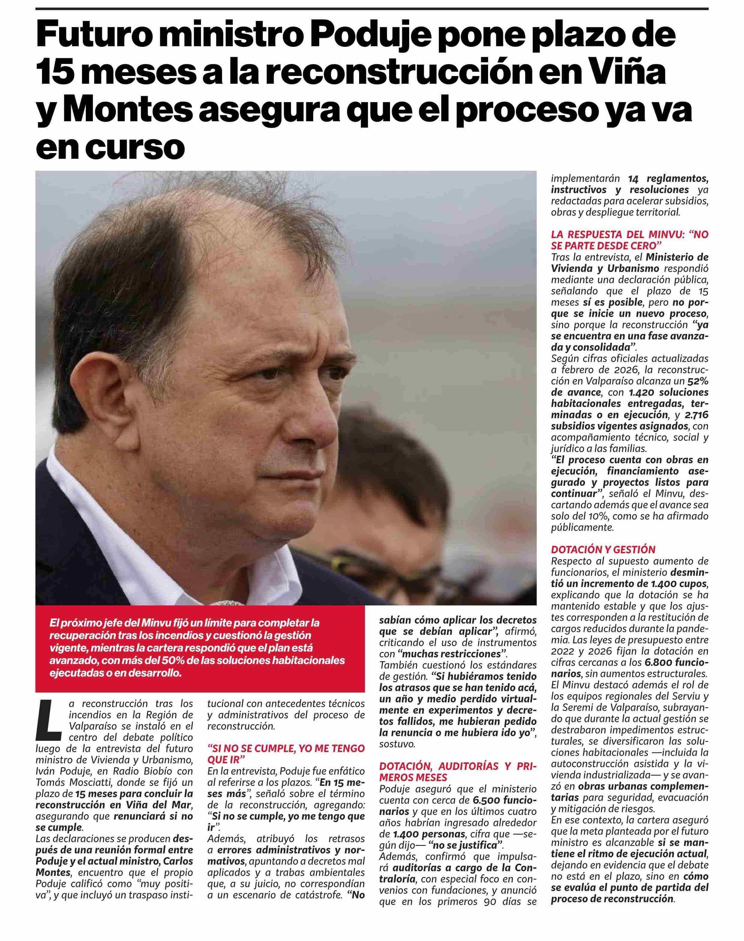 Título: Futuro ministro Poduje pone plazo de 15 meses a la reconstrucción en Viña y Montes asegura que el proceso ya va en curso