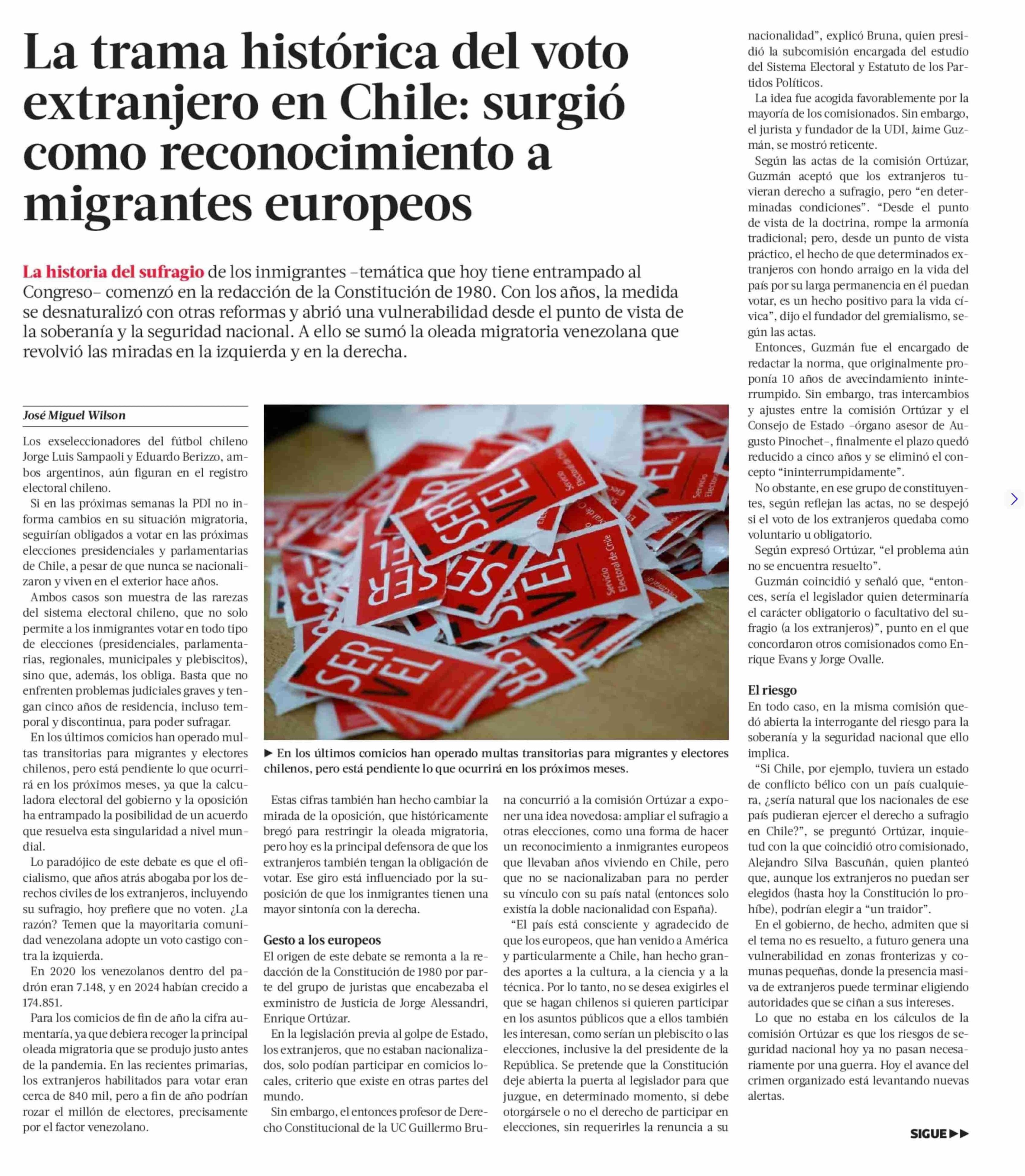 La trama histórica del voto extranjero en Chile: surgió como reconocimiento a migrantes europeos 14-07-2025 La Tercera |