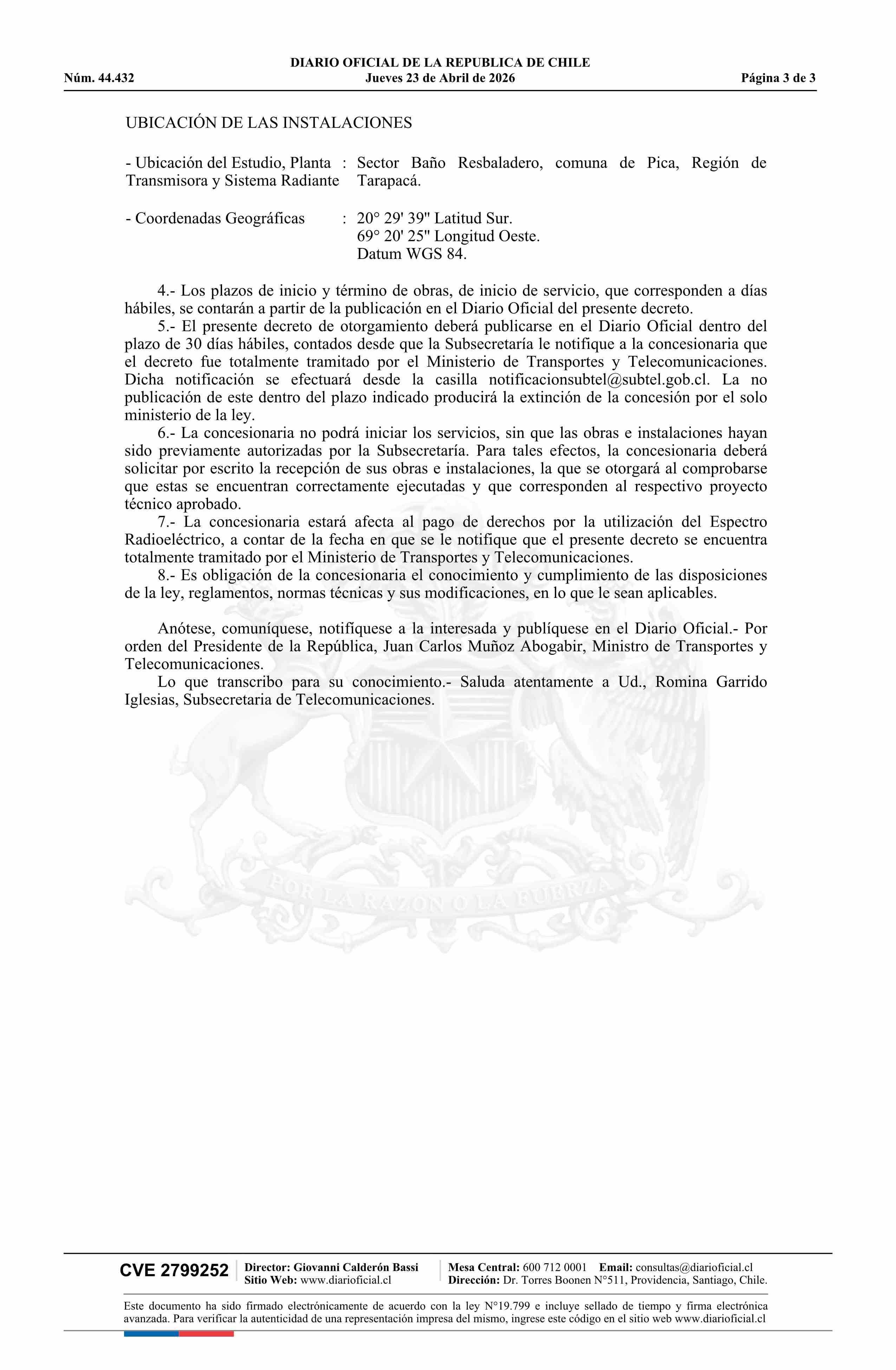 | Título: | Decreto exento número 243, de 2026.- Otorga concesión de radiodifusión sonora en frecuencia modulada para la localidad de Pica |
