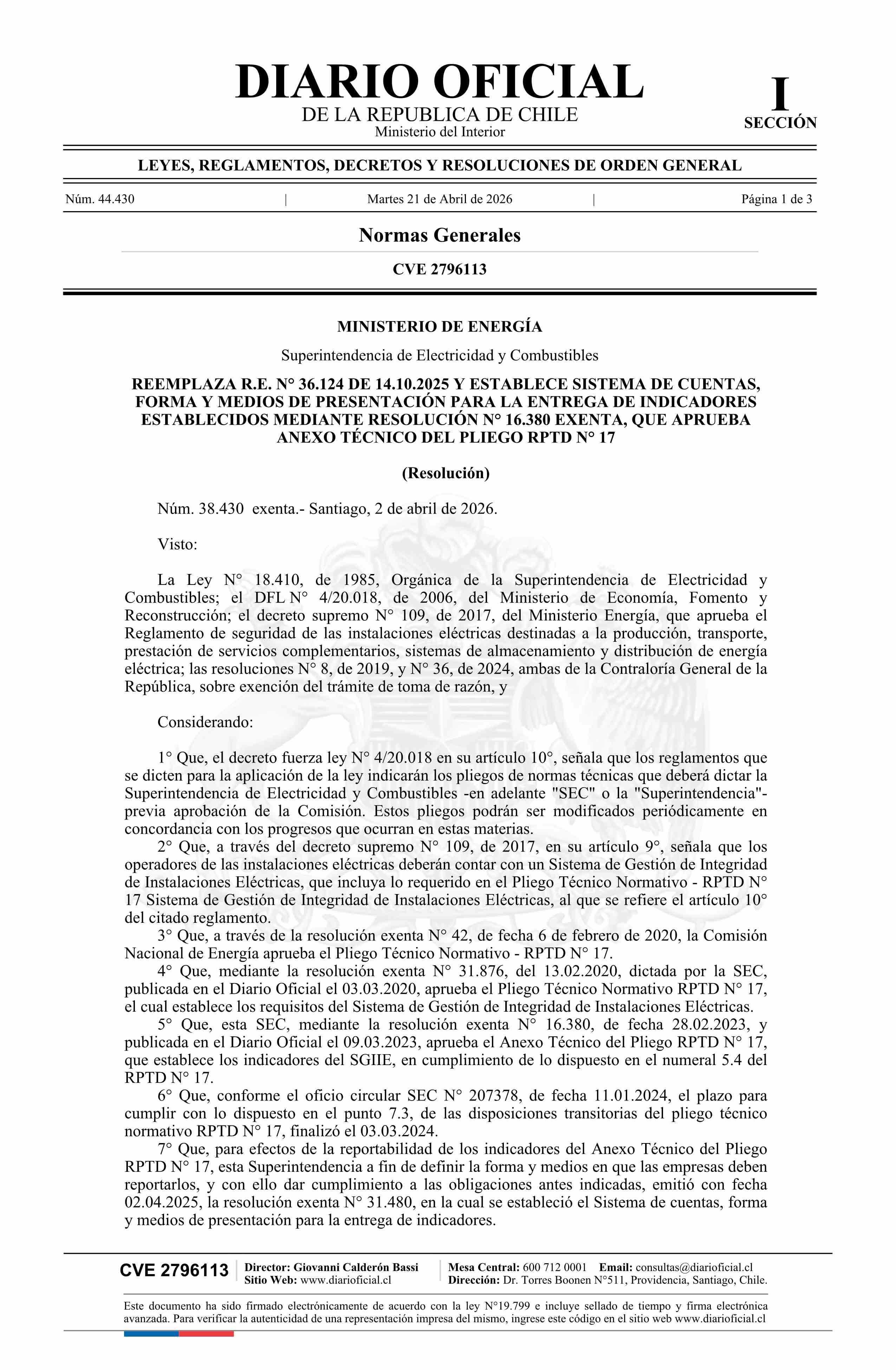 | Título: | Resolución exenta número 38.430, de 2026.- Reemplaza resolución N° 36.124 exenta, de 2025, y establece sistema de cuentas, forma y medios de presentación para la entrega de indicadores establecidos mediante resolución N° 16.380 exenta, de 2023, que aprueba anexo técnico del pliego RPTD N° 17 |
