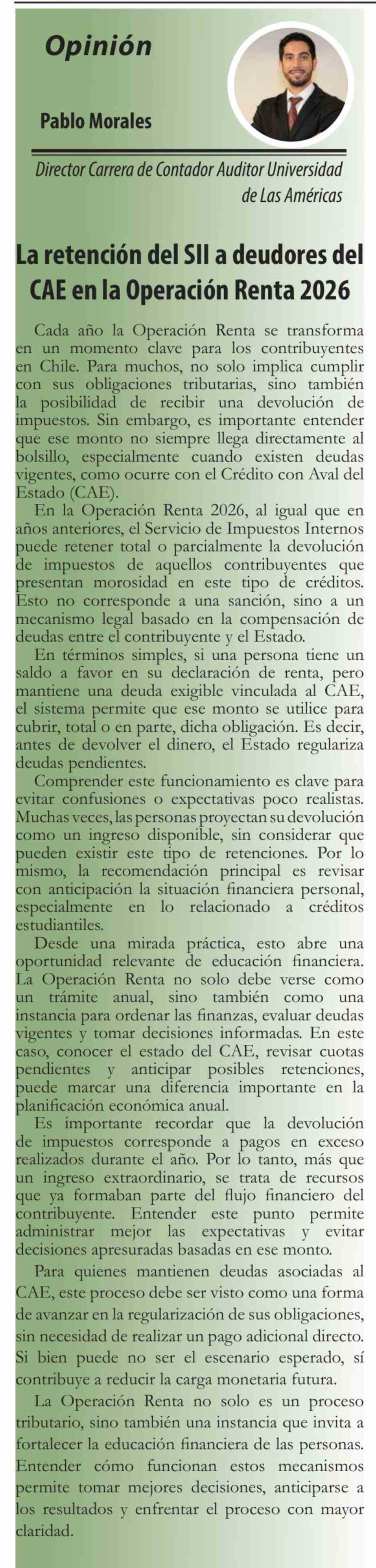 | Título: | Columnas de Opinión: La retención del SII a deudores del CAE en la Operación Renta 2026 |