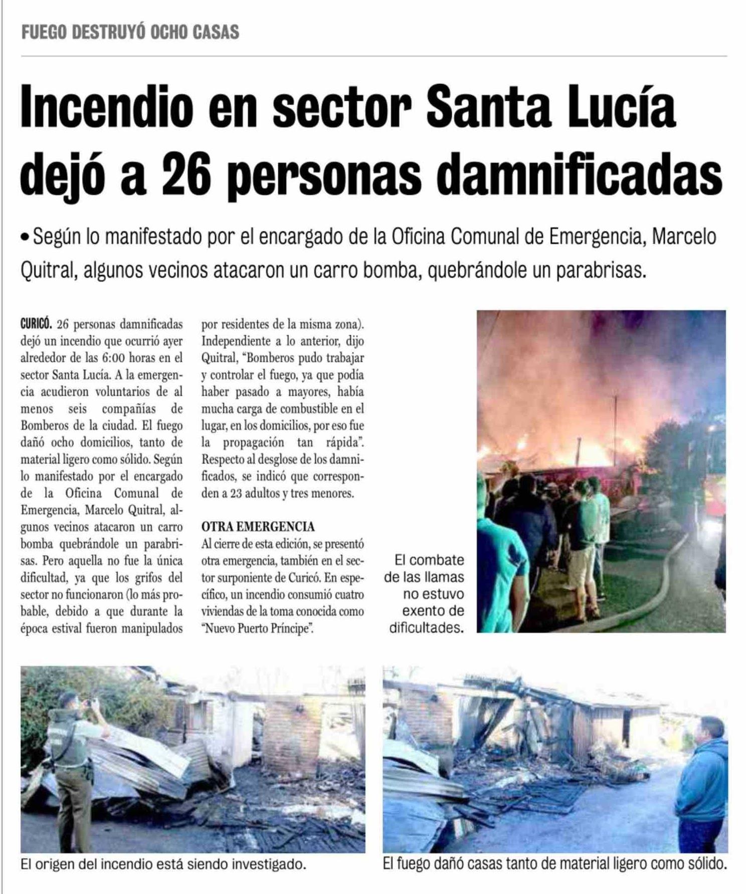 Incendio en sector Santa Lucía dejó a 26 personas damnificadas 08-03-2026 La Prensa de Curicó |