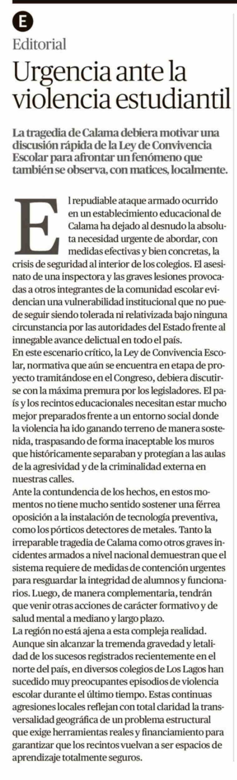 Editorial: Urgencia ante la violencia estudiantil 29-03-2026 El Austral de Osorno |