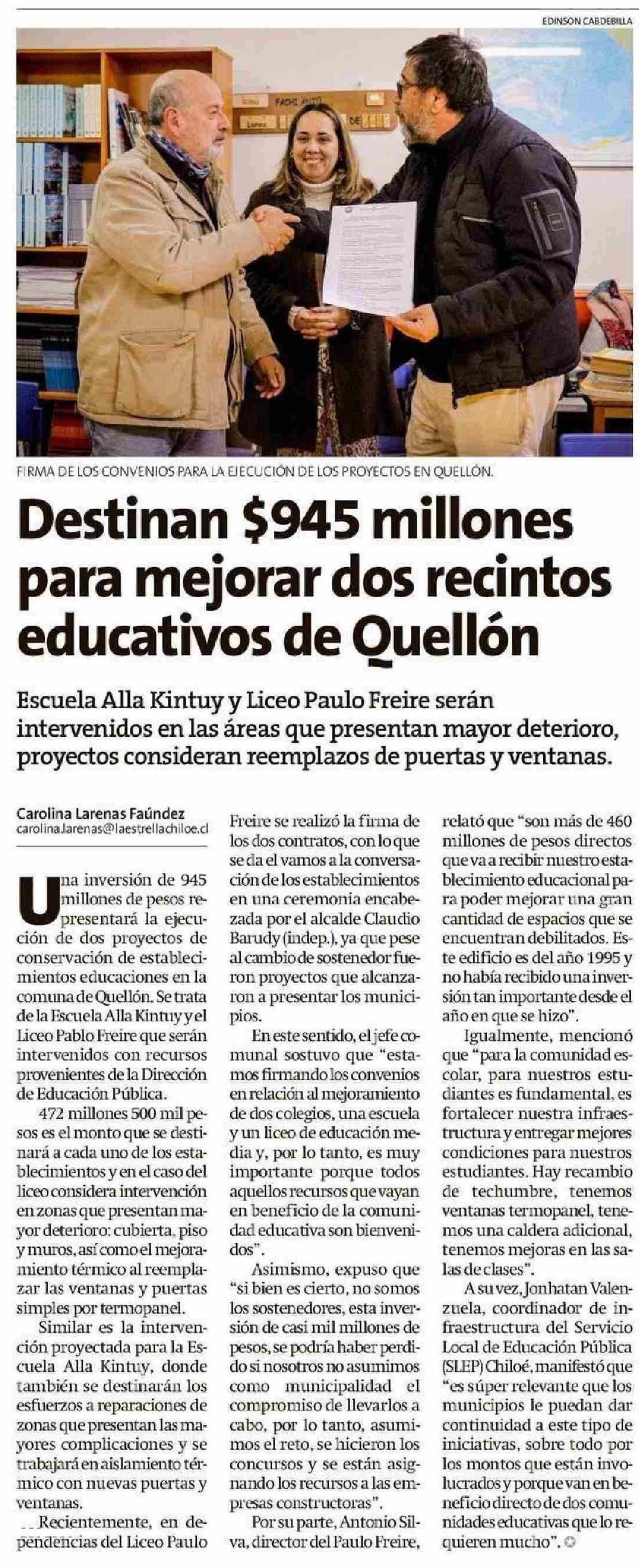 Título: Destinan $945 millones para mejorar dos recintos educativos de Quellón
