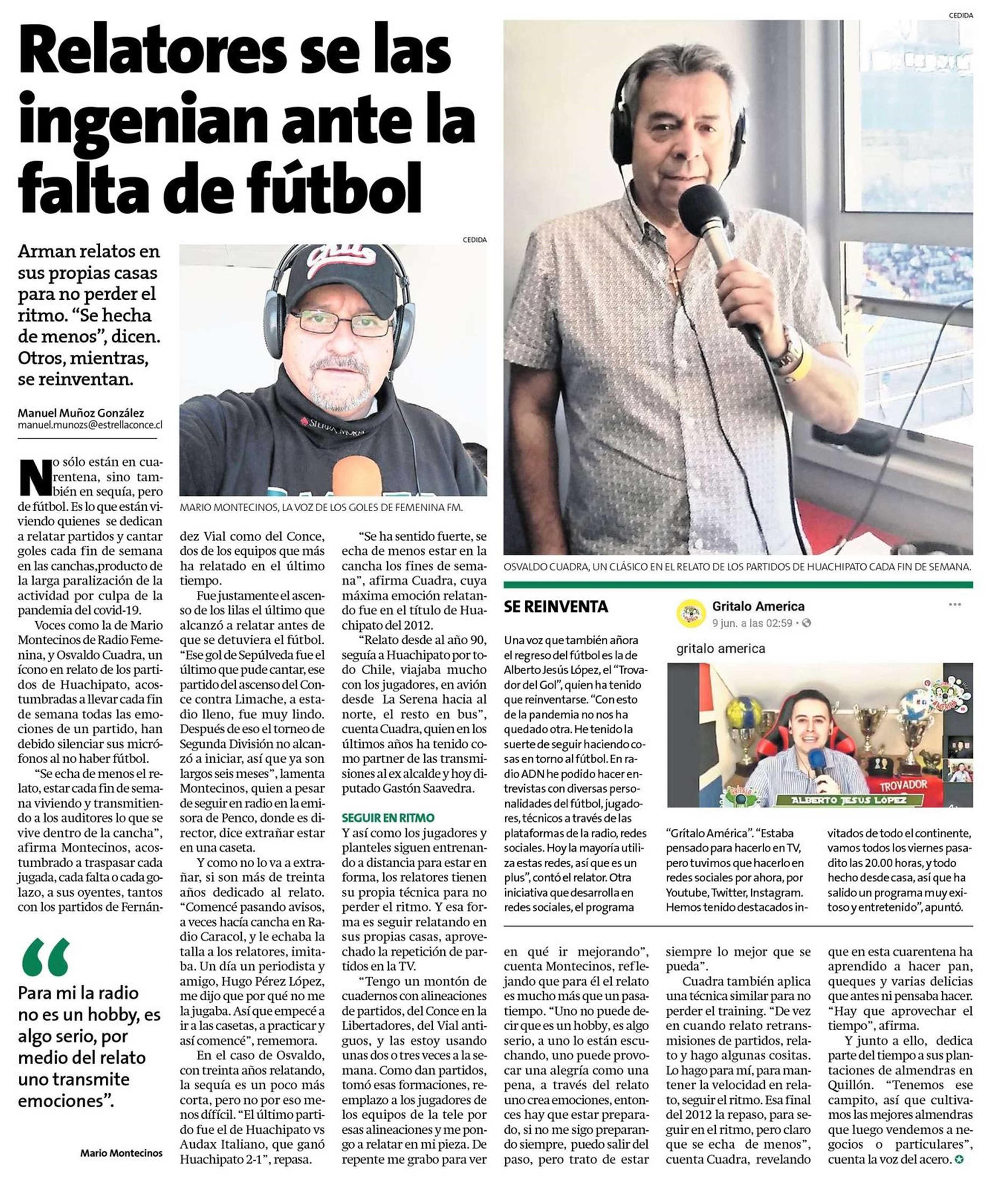 Relatores se las ingenian ante la falta de fútbol 20-06-2020 La Estrella de Concepción |