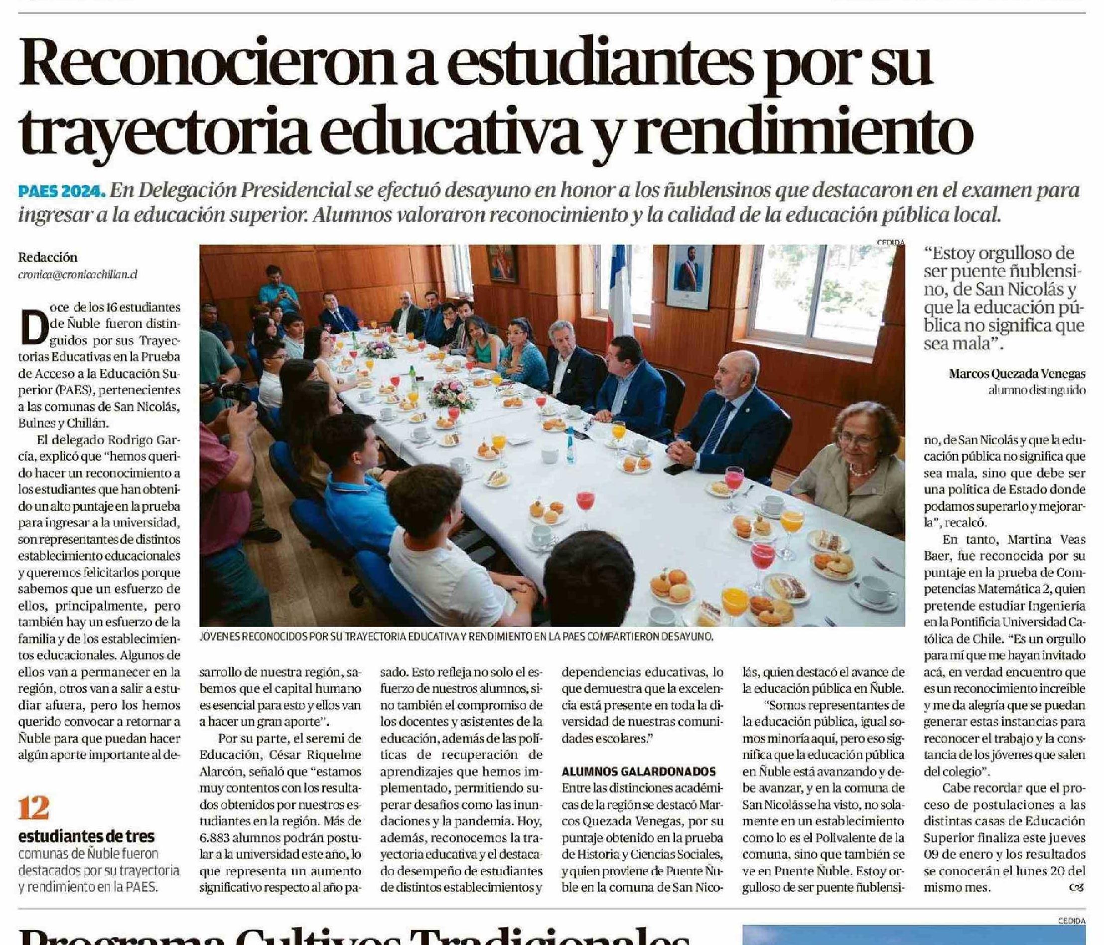 Reconocieron a estudiantes por su trayectoria educativa y rendimiento 09-01-2025 Crónica de Chillán |