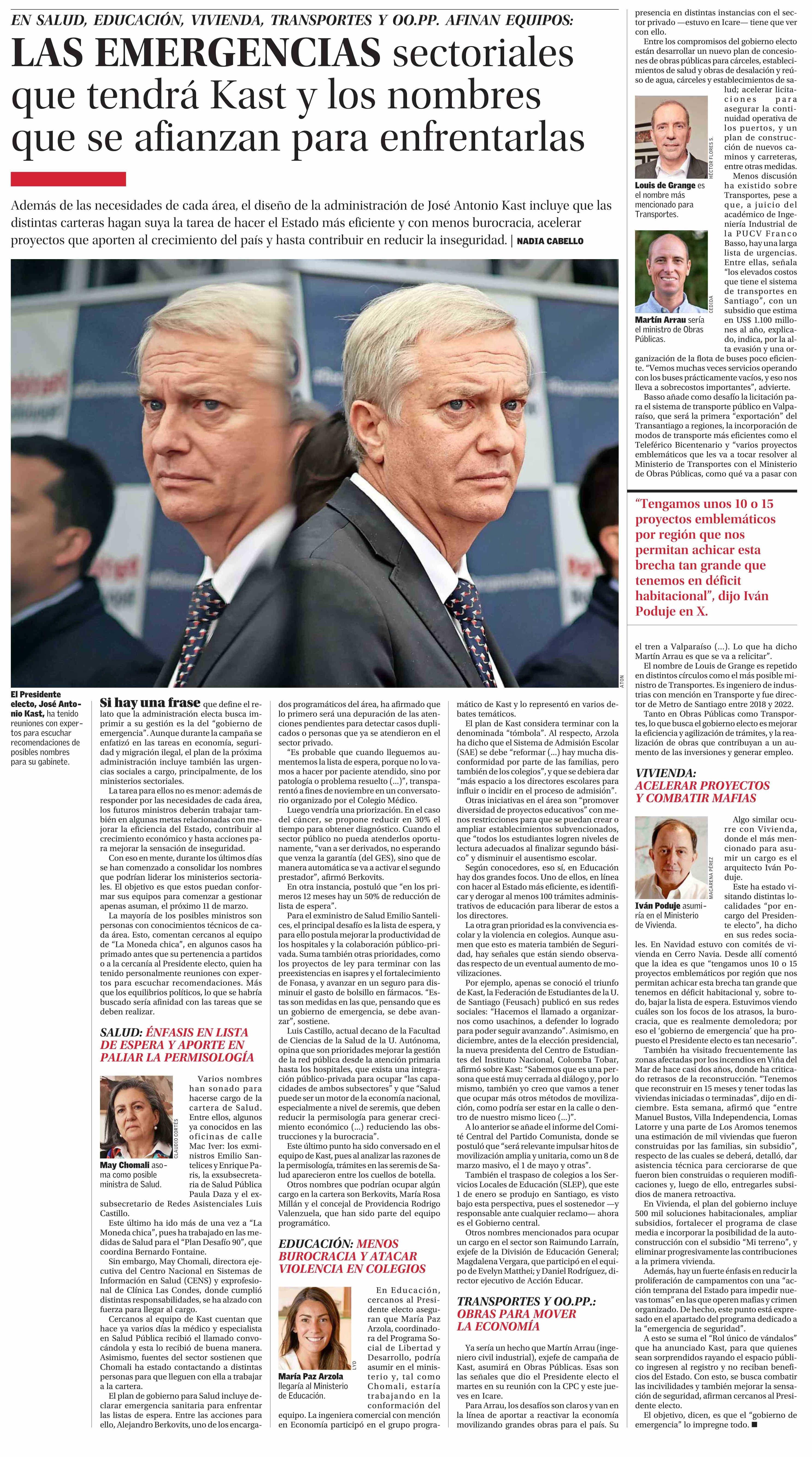 Título: LAS EMERGENCIAS sectoriales que tendrá Kast y los nombres que se afianzan para enfrentarlas