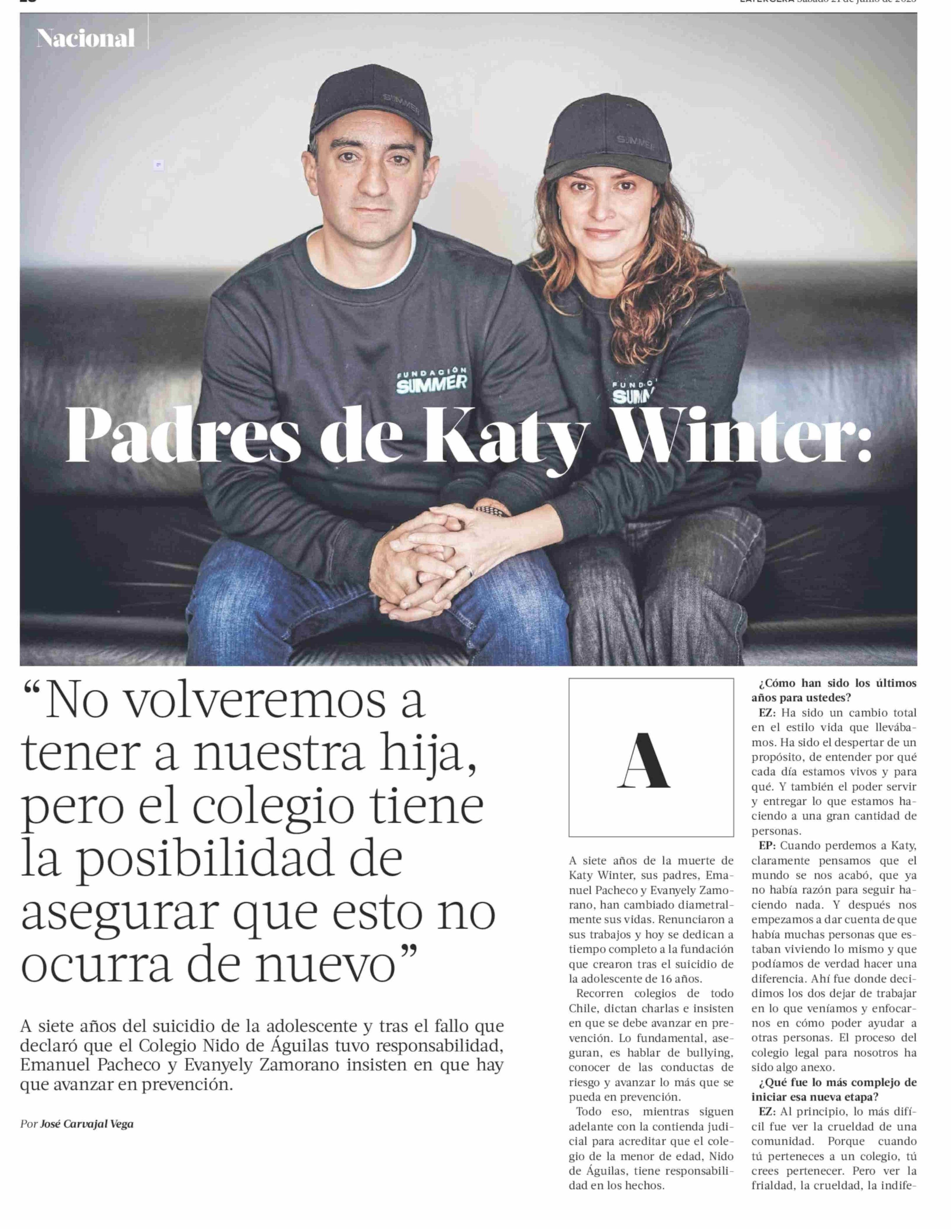 Padres de Katy Winter: “No volveremos a tener a nuestra hija, pero el colegio tiene la posibilidad de asegurar que esto no ocurra de nuevo” 21-06-2025 La Tercera |