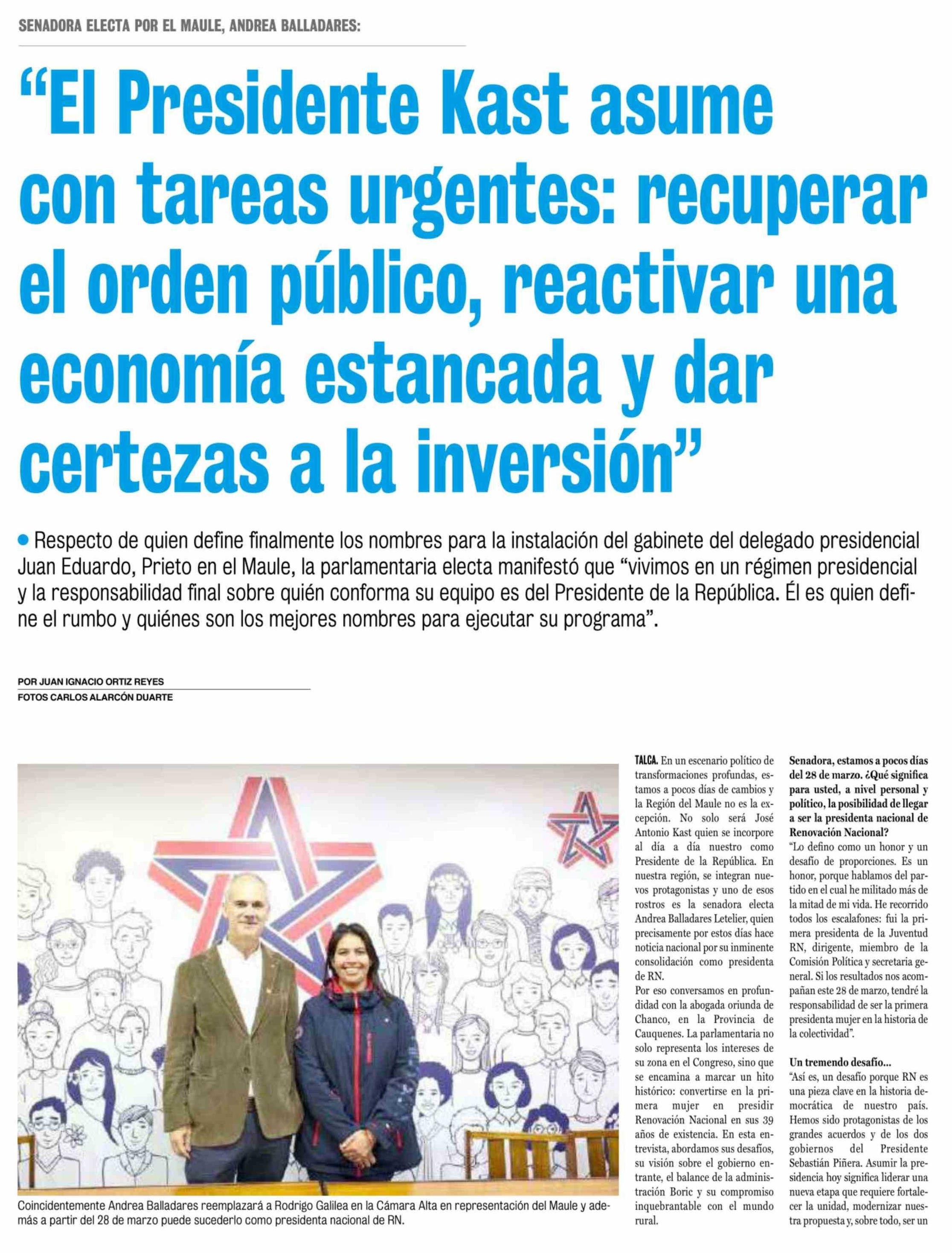 "El Presidente Kast asume con tareas urgentes: recuperar el orden público, reactivar una economía estancada y dar certezas a la inversión 08-03-2026 La Prensa de Curicó |