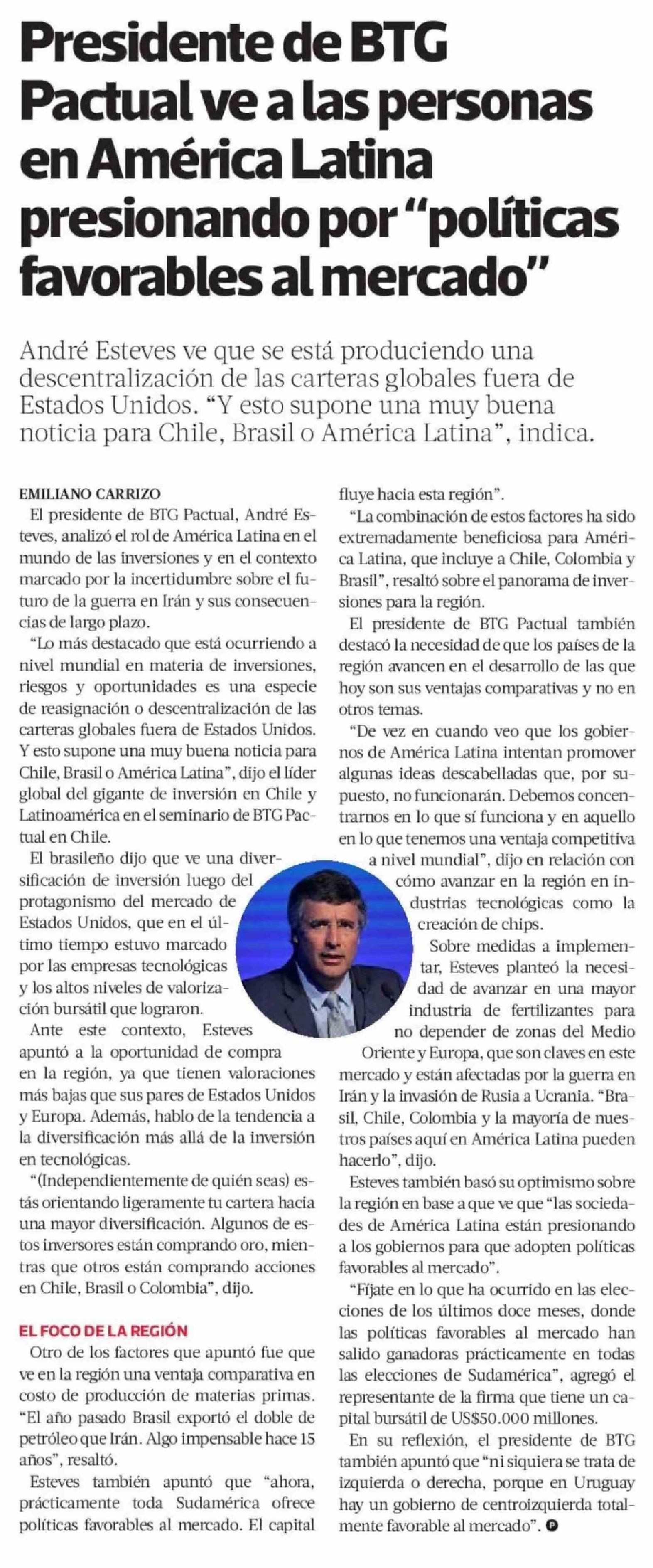 Título: Presidente de BTG Pactual ve a las personas en América Latina presionando por "políticas favorables al mercado"