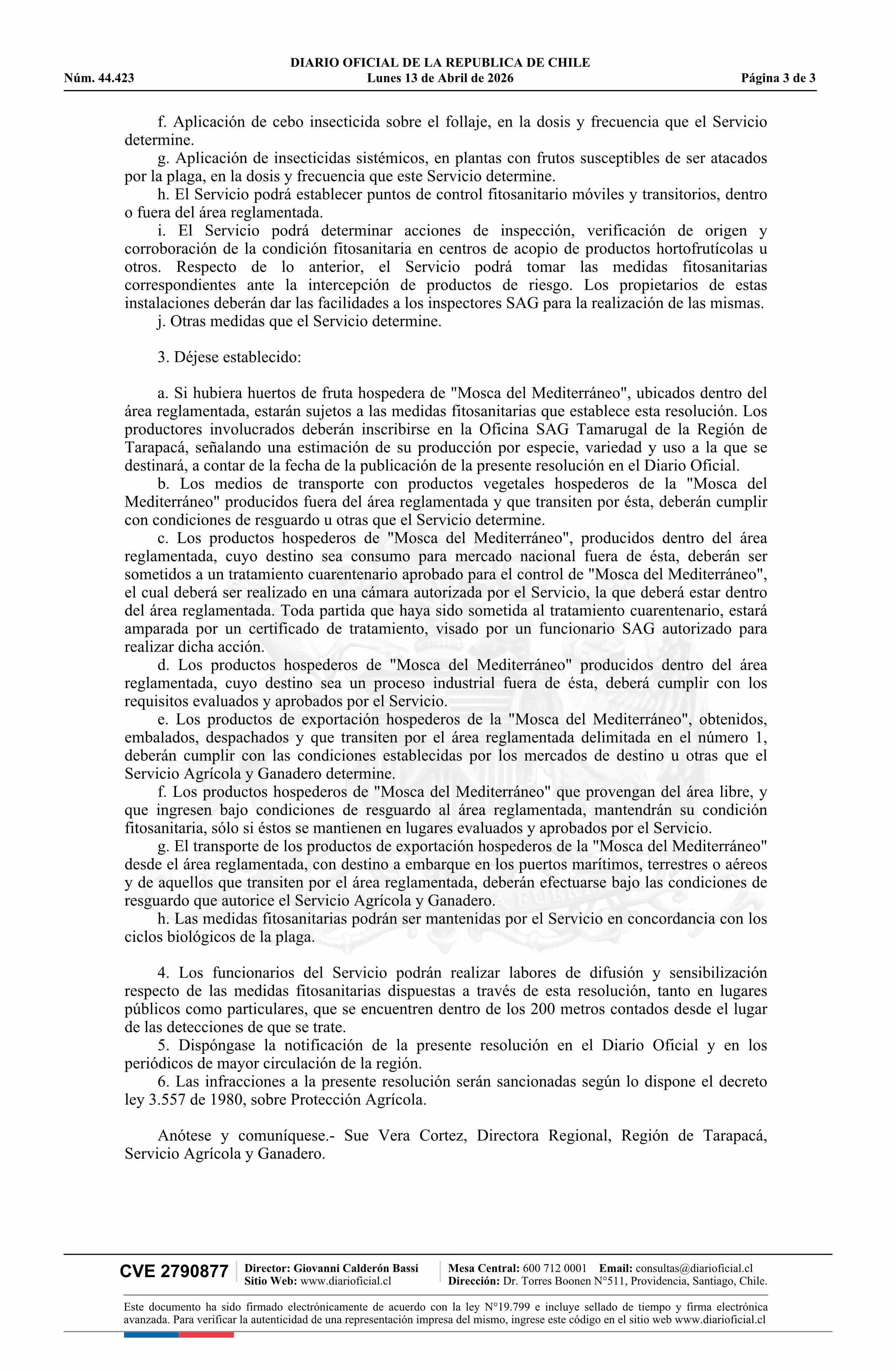 | Título: | Resolución exenta número 115, de 2026.- Establece regulaciones cuarentenarias para el control y erradicación de la Mosca del Mediterráneo (Ceratitis capitata W.), en los lugares que indica para el mercado de China |