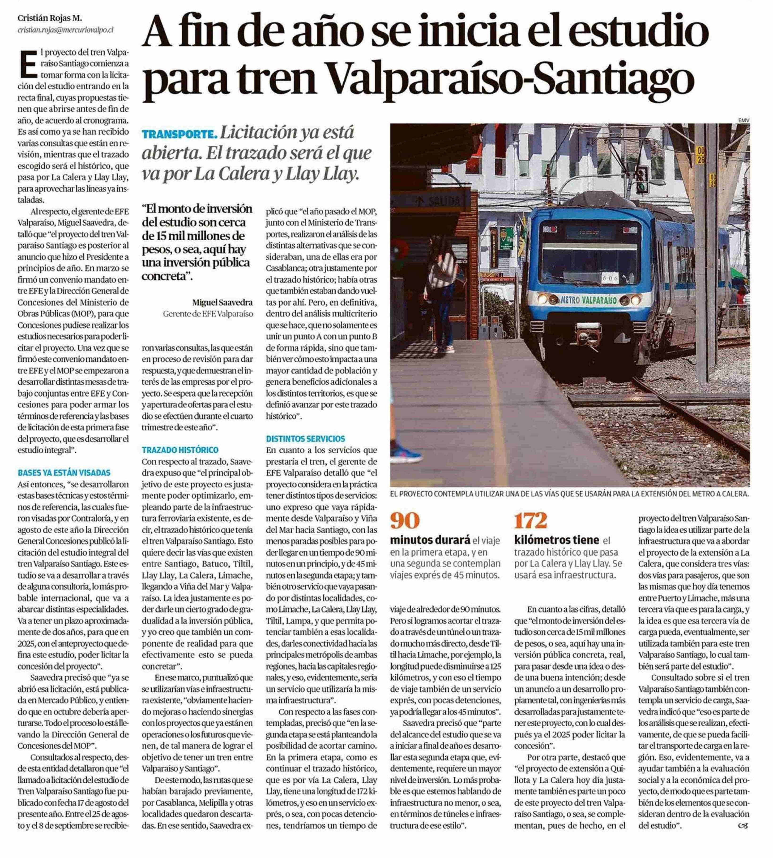 A fin de año se inicía el estudio para tren Valparaíso-Santiago 19-09-2023 El Mercurio de Valparaíso |