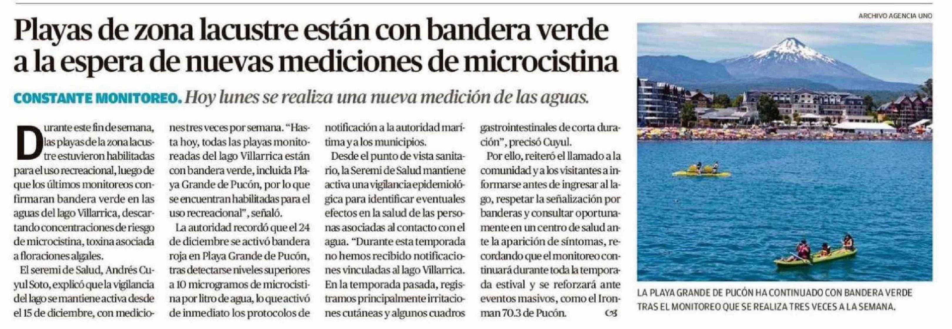 Playas de zona lacustre están con bandera verde a la espera de nuevas mediciones de microcistina 05-01-2026 El Austral de la Araucanía |
