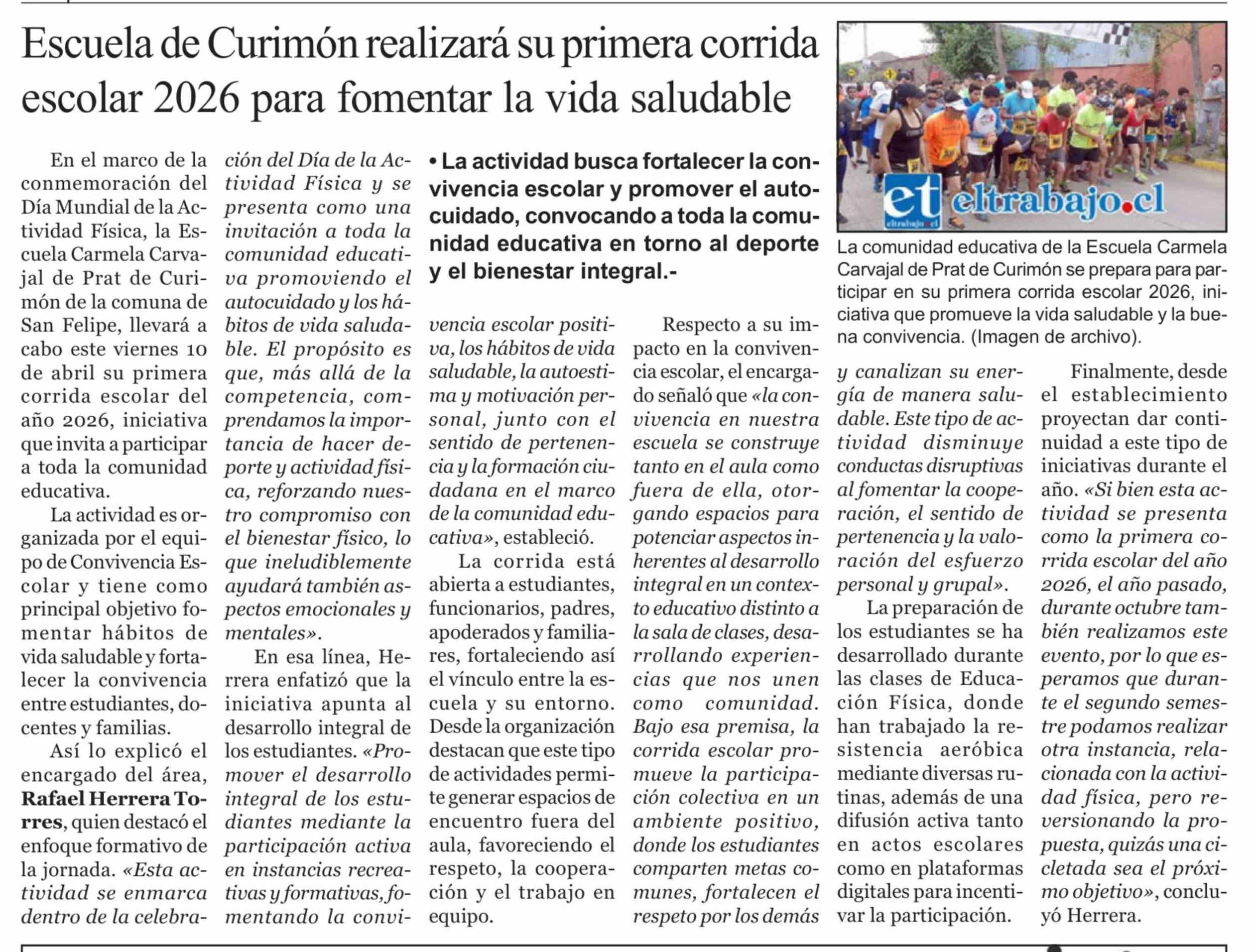 Título: Escuela de Curimón realizará su primera corrida escolar 2026 para fomentar la vida saludable