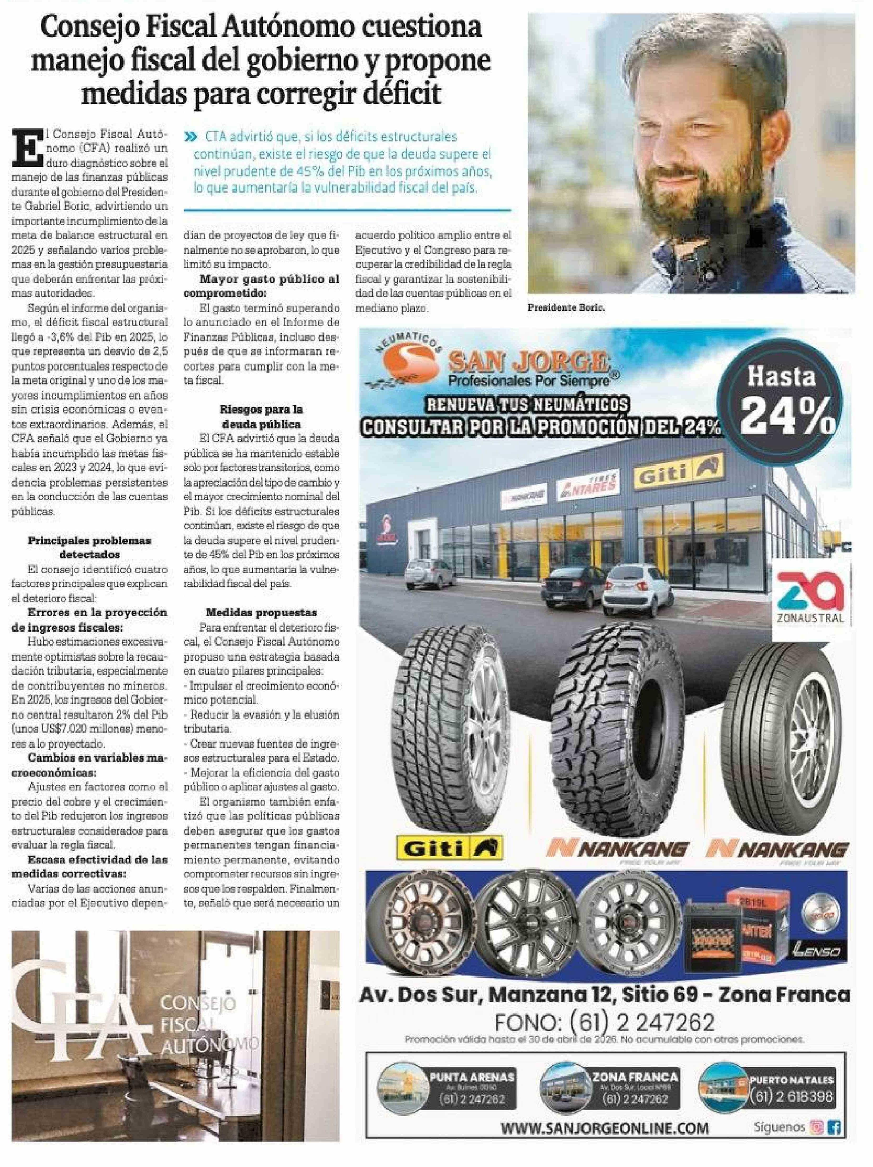 Consejo Fiscal Autónomo cuestiona manejo fiscal del gobierno y propone medidas para corregir déficit 06-03-2026 La Prensa Austral |