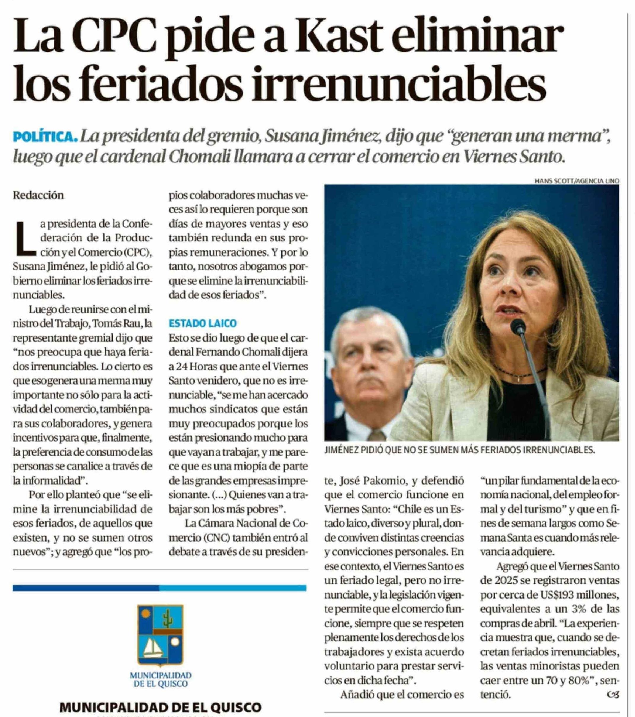 La CPC pide a Kast eliminar los feriados irrenunciables 18-03-2026 El Mercurio de Valparaíso |