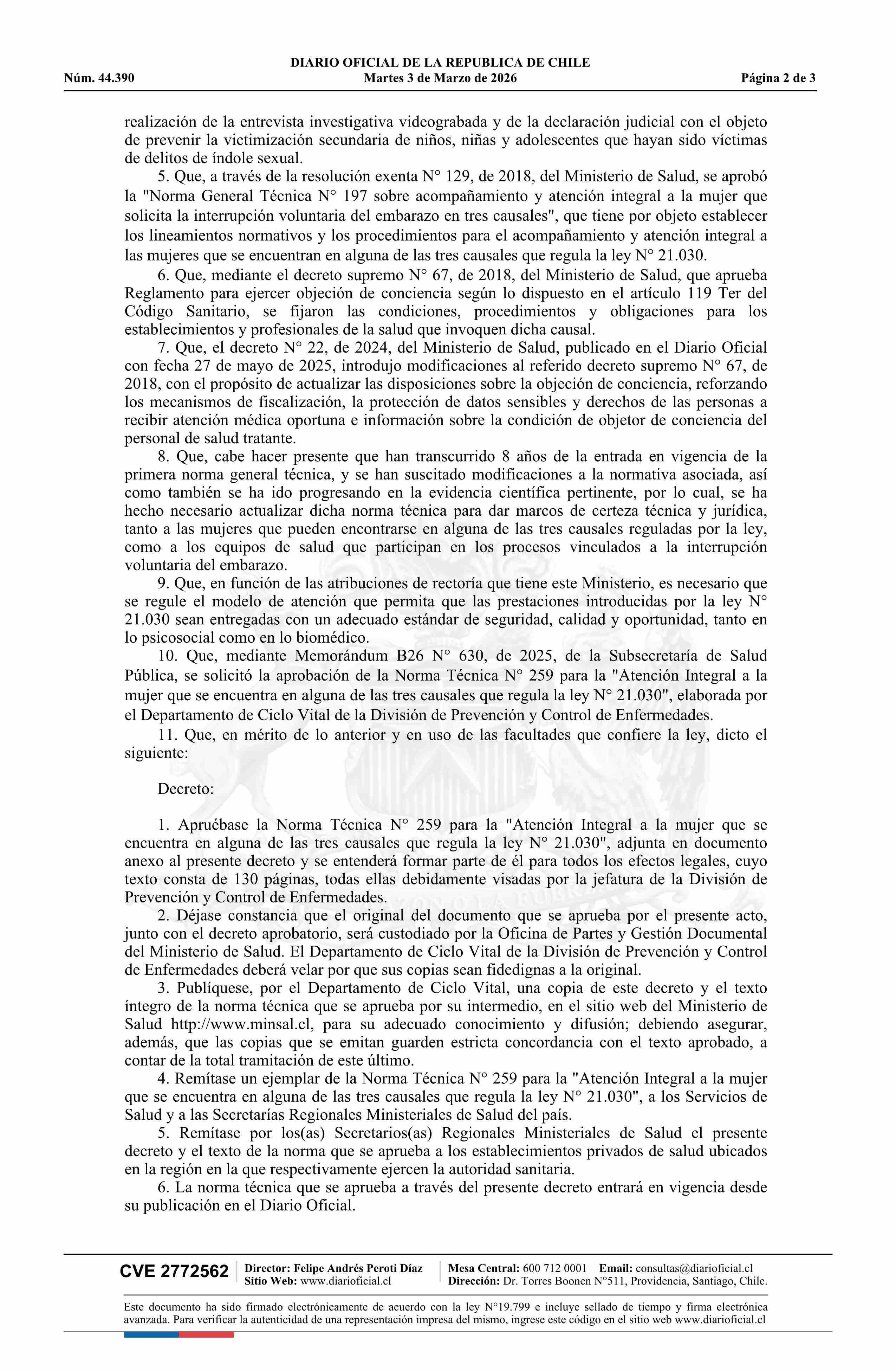 | Título: | Decreto exento número 16, de 2026.- Aprueba norma técnica N° 259 para la atención integral a la mujer que se encuentra en alguna de las tres causales que regula la ley N° 21.030 y deja sin efecto resolución N° 129 exenta, de 2018 |